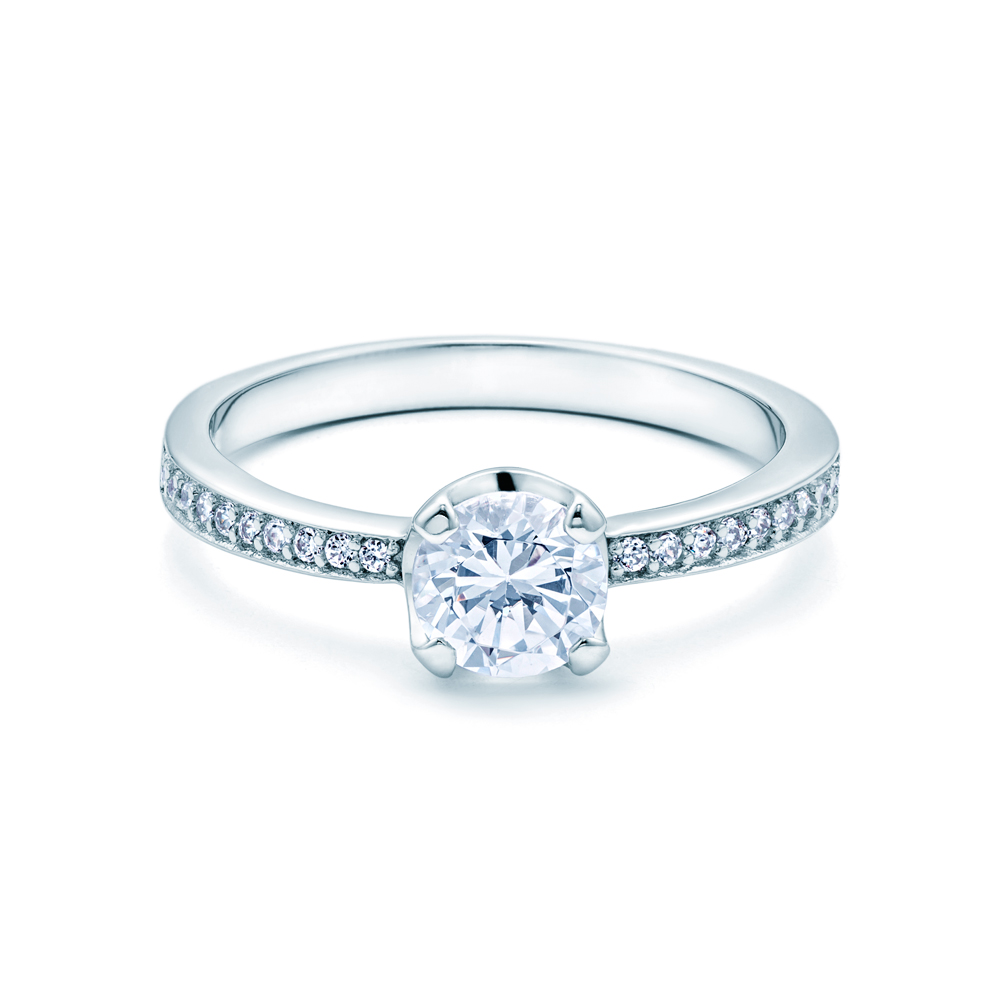 Pierścionek zaręczynowy z diamentami o szlifie brylantowym wysokiej czystości SI/H, o łącznej masie 0,50 ct (centralny 0,30 ct oraz 20 bocznych o masie 0,01 ct). Wykonany z 14-karatowego białego złota (próba 0,585).