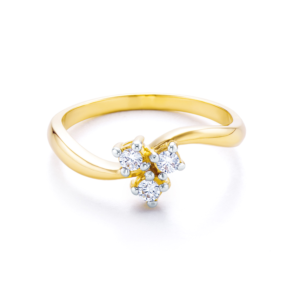 Pierścionek z 3 cyrkoniami o szlifie brylantowym oraz średnicy 3x2,3 mm. Wykonany z połączenia 14-karatowego żółtego oraz białego złota (próba 0,585) o wadze ok. 2,21 g.