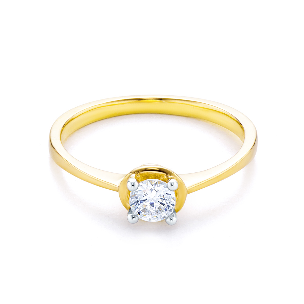Pierścionek z cyrkonią o szlifie brylantowym oraz średnicy 4,00 mm. Wykonany z połączenia 14-karatowego żółtego oraz białego złota (próba 0,585).