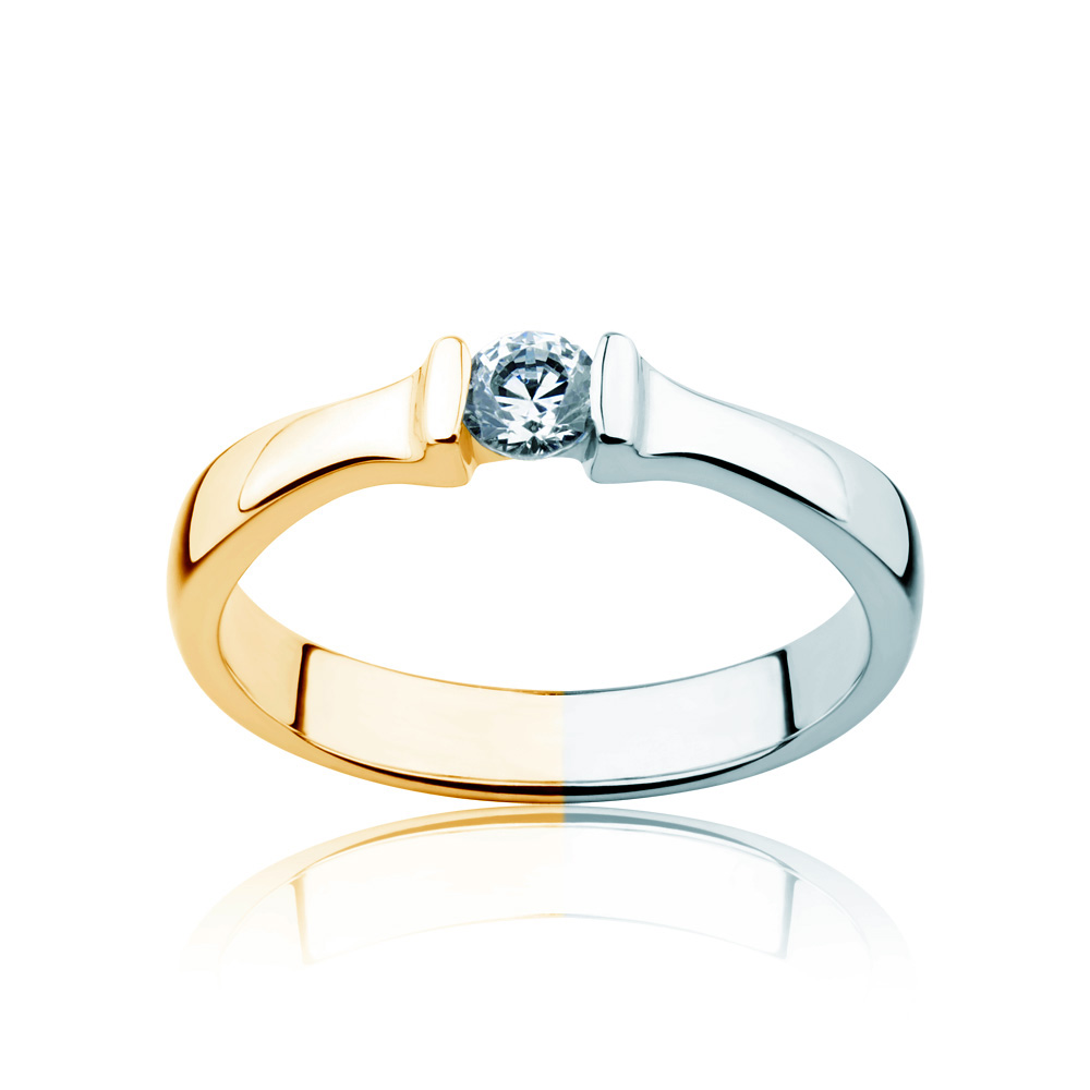 Pierścionek zaręczynowy z diamentem 0,18 ct o szlifie brylantowym wysokiej czystości SI/H, wykonany z połączenia 14-karatowego żółtego oraz białego złota (próba 0,585).