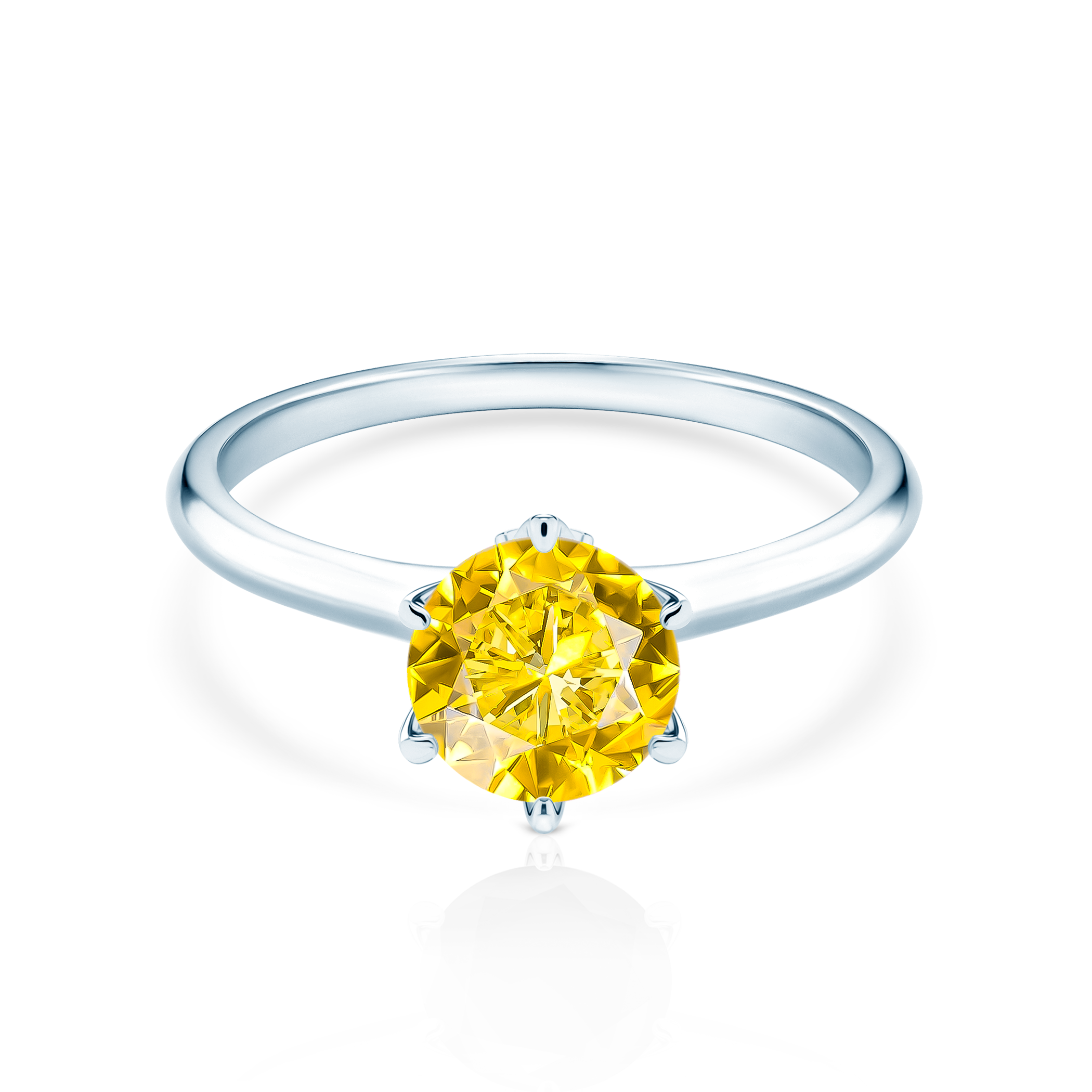 Pierścionek zaręczynowy z centralnie umieszczonym żółtym szafirem o masie 1,00 ct oraz dwoma diamentami o łącznej masie 0,03 ct, wysokiej czystości SI/H, o szlifie brylantowym. Wykonany z 14-karatowego białego złota (próba 0,585).