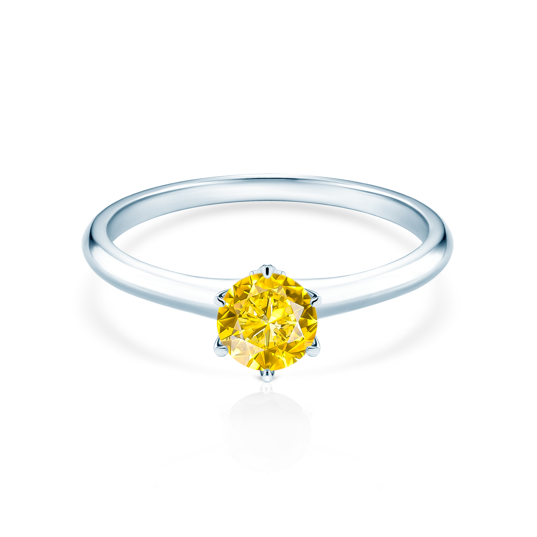 Pierścionek zaręczynowy z centralnie umieszczonym żółtym szafirem o masie 0,30 ct oraz dwoma diamentami o łącznej masie 0,03 ct, wysokiej czystości SI/H, o szlifie brylantowym. Wykonany z 14-karatowego białego złota (próba 0,585).