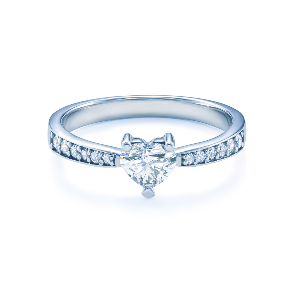 Pierścionek zaręczynowy z centralnym diamentem o masie 0,50 ct wysokiej czystości SI2/H, o szlifie serce oraz bocznymi diamentami o łącznej masie 0,08 ct wysokiej czystości SI2/H, o szlifie brylantowym. Wykonany z 14-karatowego białego złota (próba 0,585).
