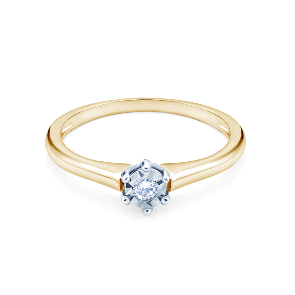Pierścionek zaręczynowy z centralnie umieszczonym diamentem 0,06 ct o perfekcyjnym szlifie brylantowym, wysokiej czystości i kolorze SI/H (wszystkie diamenty w naszym sklepie objęte są wieczystą gwarancją oraz posiadają oryginalny certyfikat jakości, wystawiany przez naszą firmę). Wykonany z połączenia 14-karatowego białego i żółtego złota (próba 585).