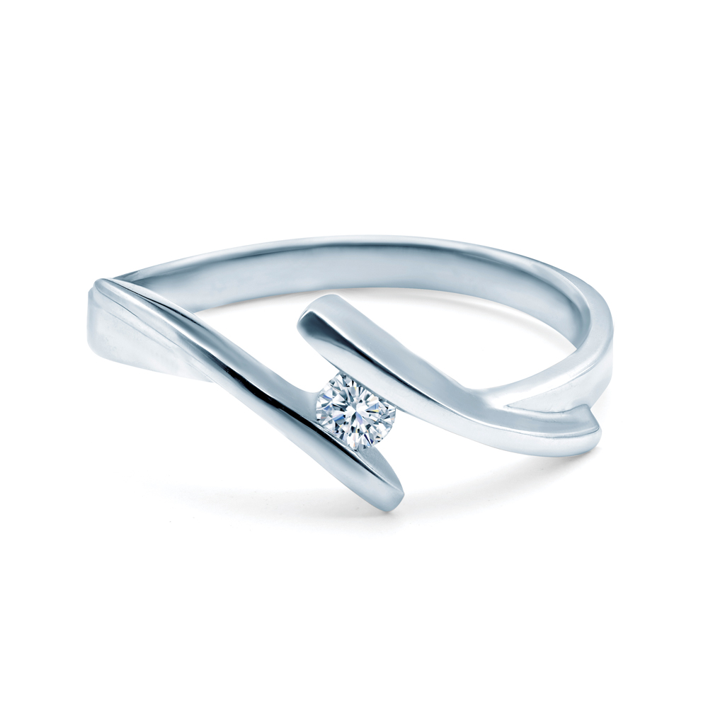 Pierścionek zaręczynowy z centralnie umieszczonym diamentem 0,05 ct o perfekcyjnym szlifie brylantowym, wysokiej czystości i kolorze SI/H (wszystkie diamenty w naszym sklepie objęte są wieczystą gwarancją oraz posiadają oryginalny certyfikat jakości, wystawiany przez naszą firmę). Wykonany z 14-karatowego białego złota (próba 585).