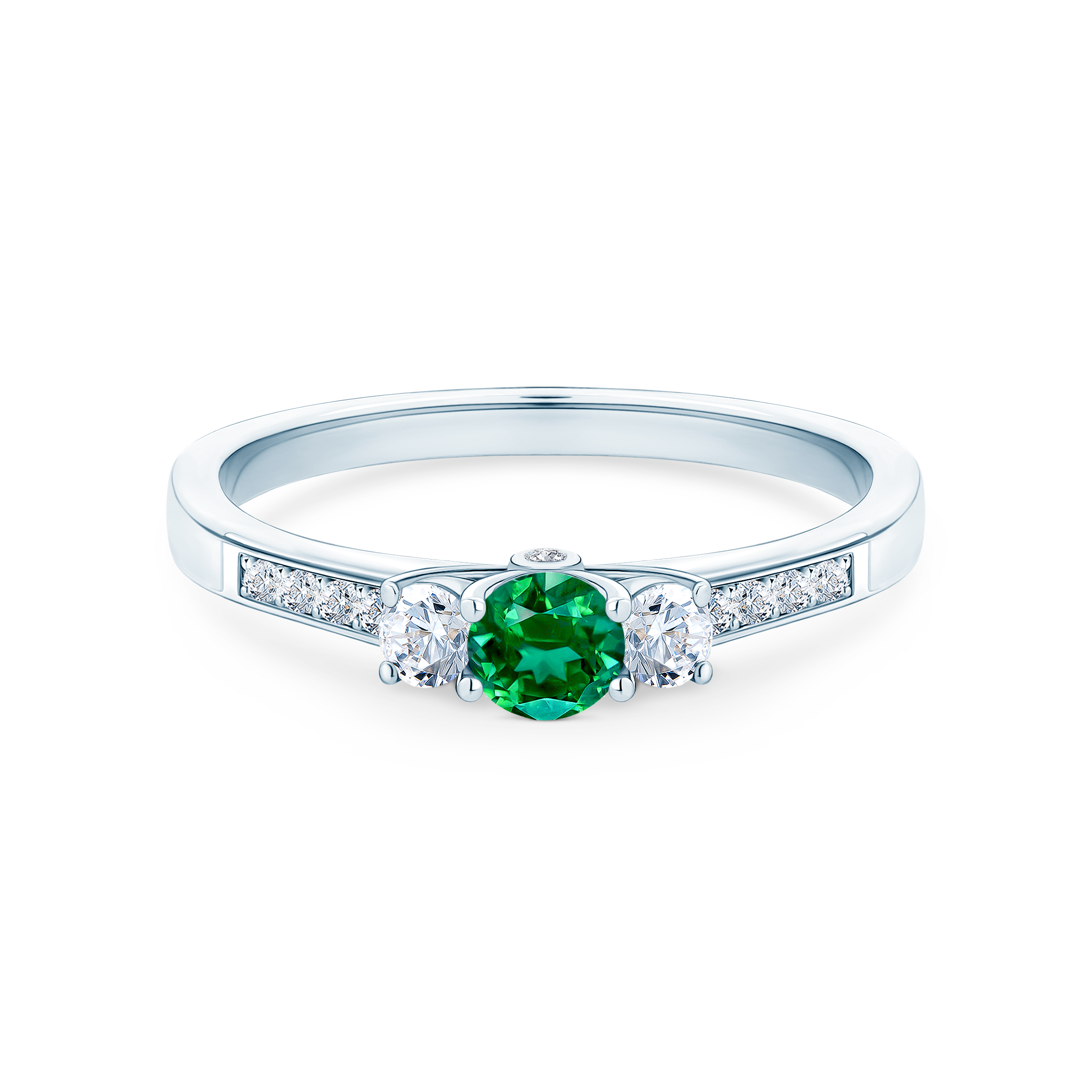Pierścionek zaręczynowy z centralnie umieszczonym szmaragdem o masie 0,10 ct oraz dwoma białymi szafirami o łącznej masie 0,08 ct. Boczne diamenty posiadają łączną masę 0,063 ct o wysokiej czystości SI/H i szlifie brylantowym. Wykonany z 14-karatowego białego złota (próba 585).