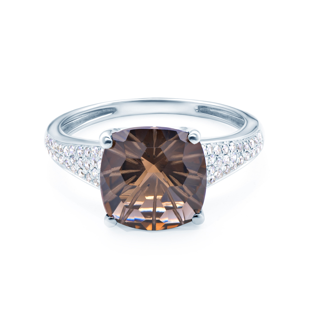 Pierścionek zaręczynowy z centralnie umieszczonym kwarcem o masie 2,72 ct oraz perfekcyjnym szlifie poduszkowym. Boczne diamenty posiadają łączną masę 0,16 ct, nieskazitelną czystość i kolor SI/H z doskonałym szlifem brylantowym. Wykonany z 14-karatowego białego złota (próba 585).