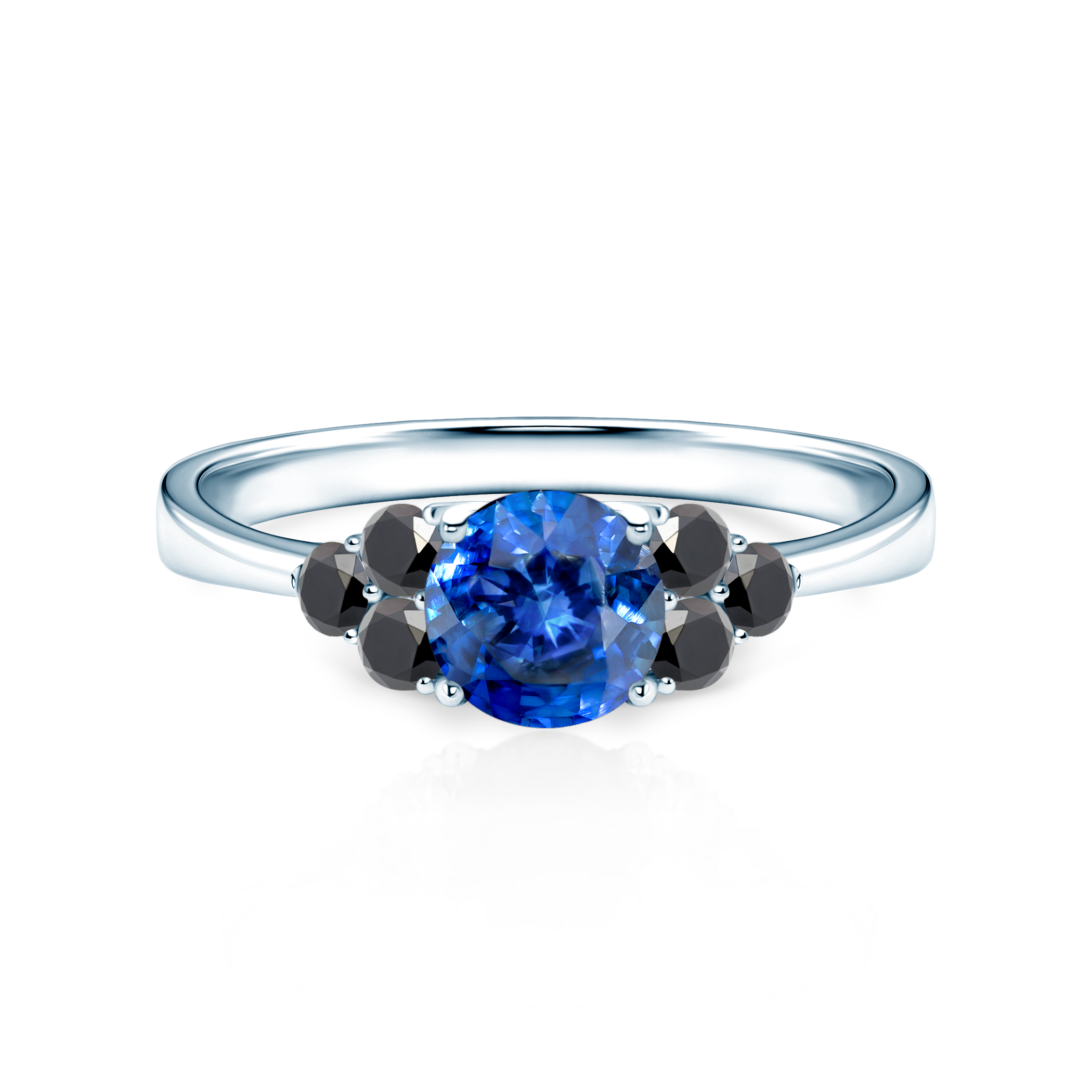 Ten olśniewający pierścionek zaręczynowy z niebieskim szafirem o szlifie brylantowym i masie 0,50 ct oraz otaczającymi go sześcioma czarnymi diamentami, wykonany został z 14-karatowego białego złota próby 0,585.