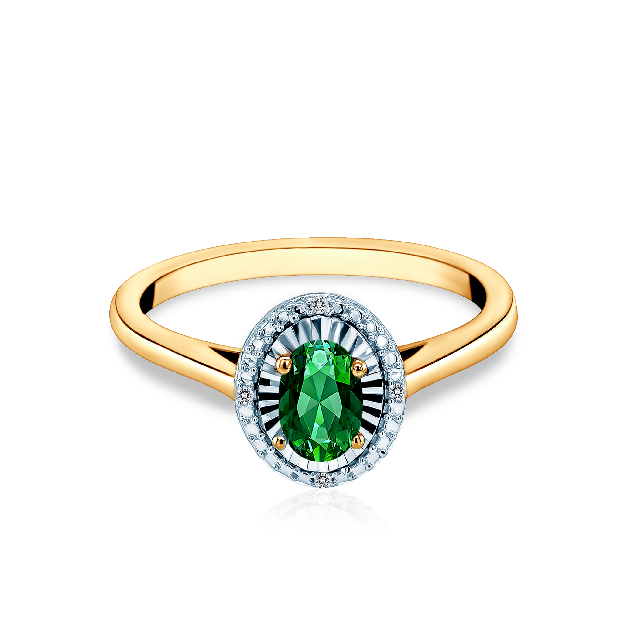 | Pierścionek zaręczynowy ze szmaragdem o masie 0,4ct (6x4mm) oraz 4 diamentami o łącznej masie 0,01ct i parametrach SI2/H w szlifie brylantowym. Wykonany został z 14-karatowego dwukolorowego złota (próba 585). |