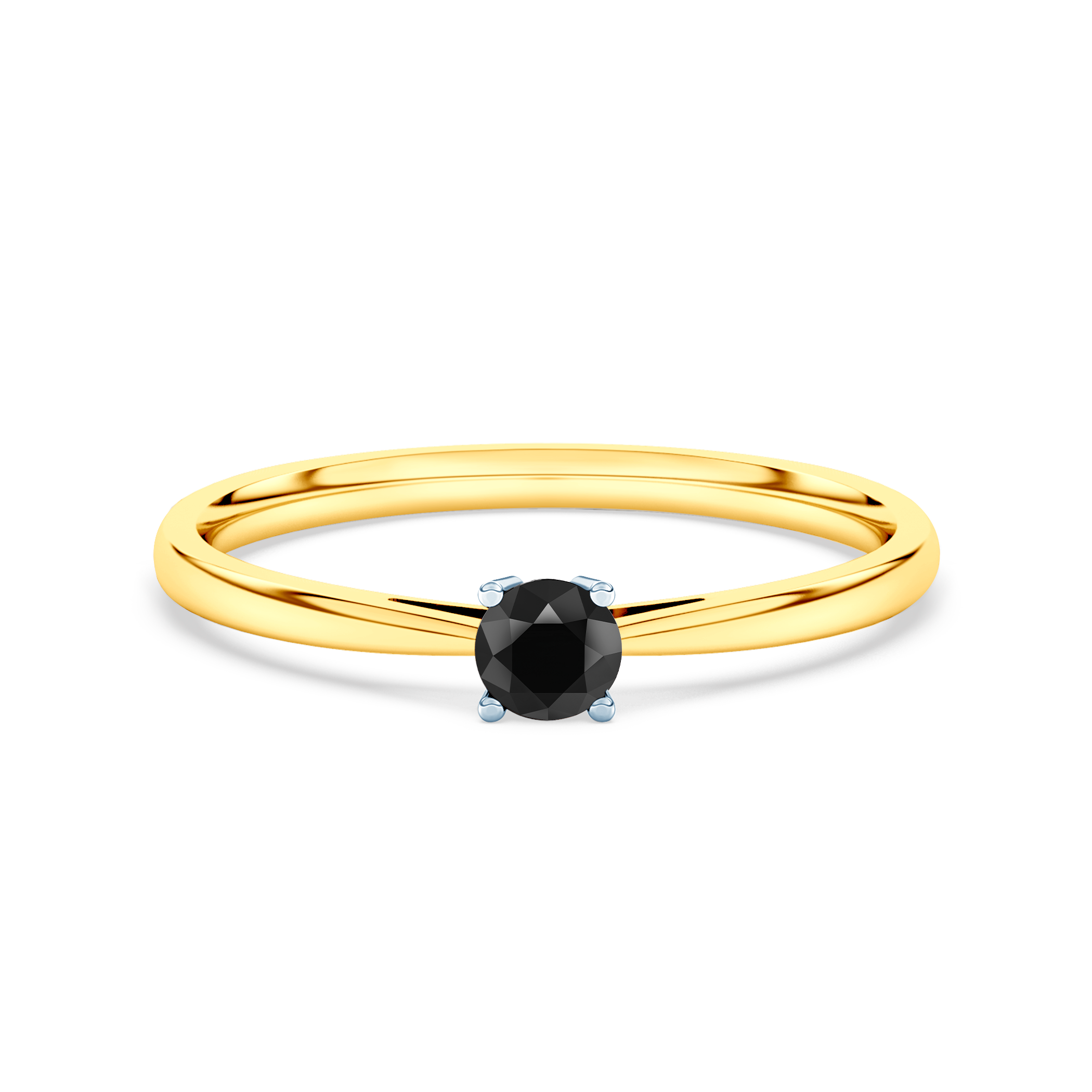 | Pierścionek zaręczynowy z czarnym diamentem o masie 0,1ct w szlifie brylantowym. Wykonany został z 14-karatowego żółtego złota (próba 585). |