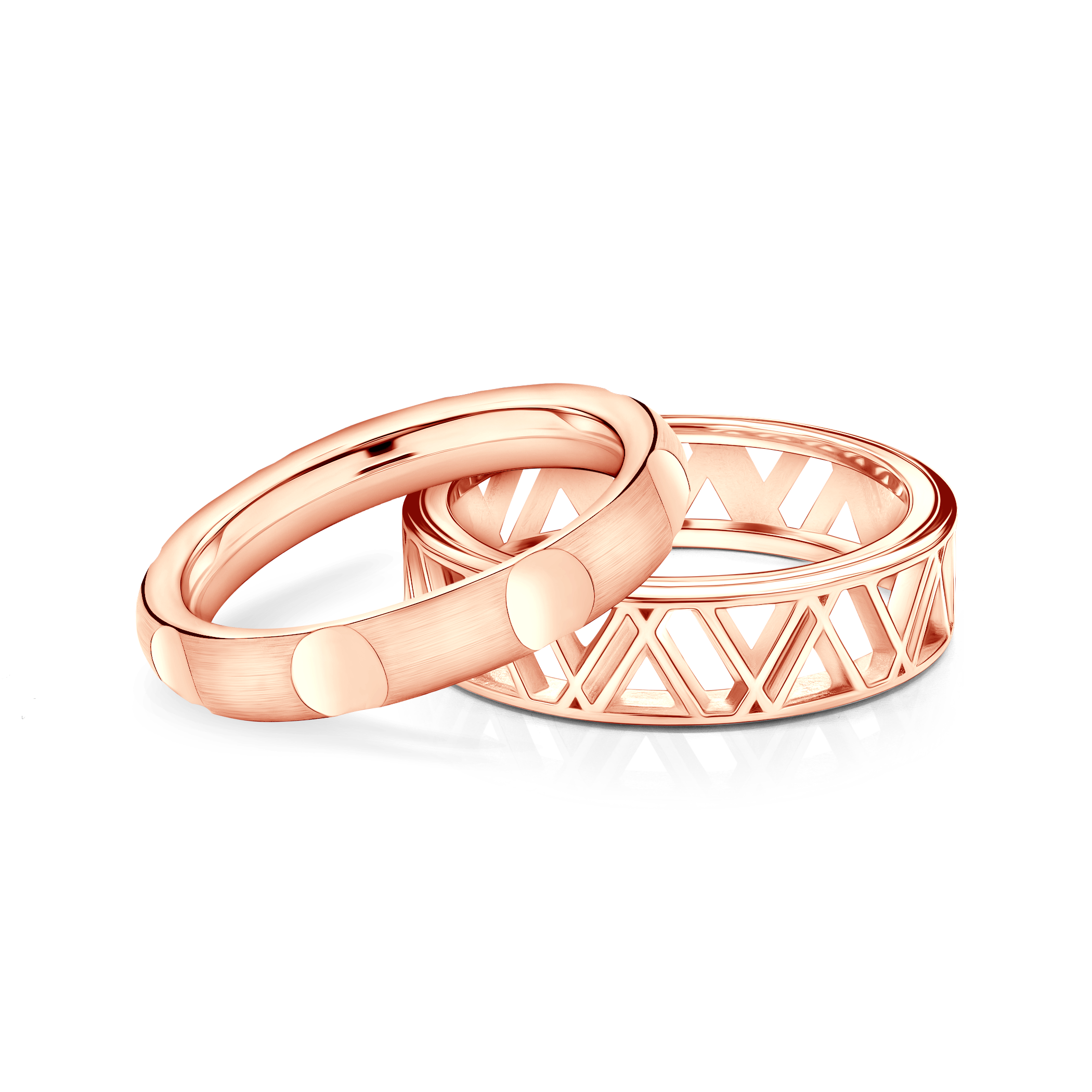 Obrączki partnerskie BeLoved® wykonane z różowego złota (próba 585) o szerokości 3,5mm, matowa i 5,5mm ażurowa.