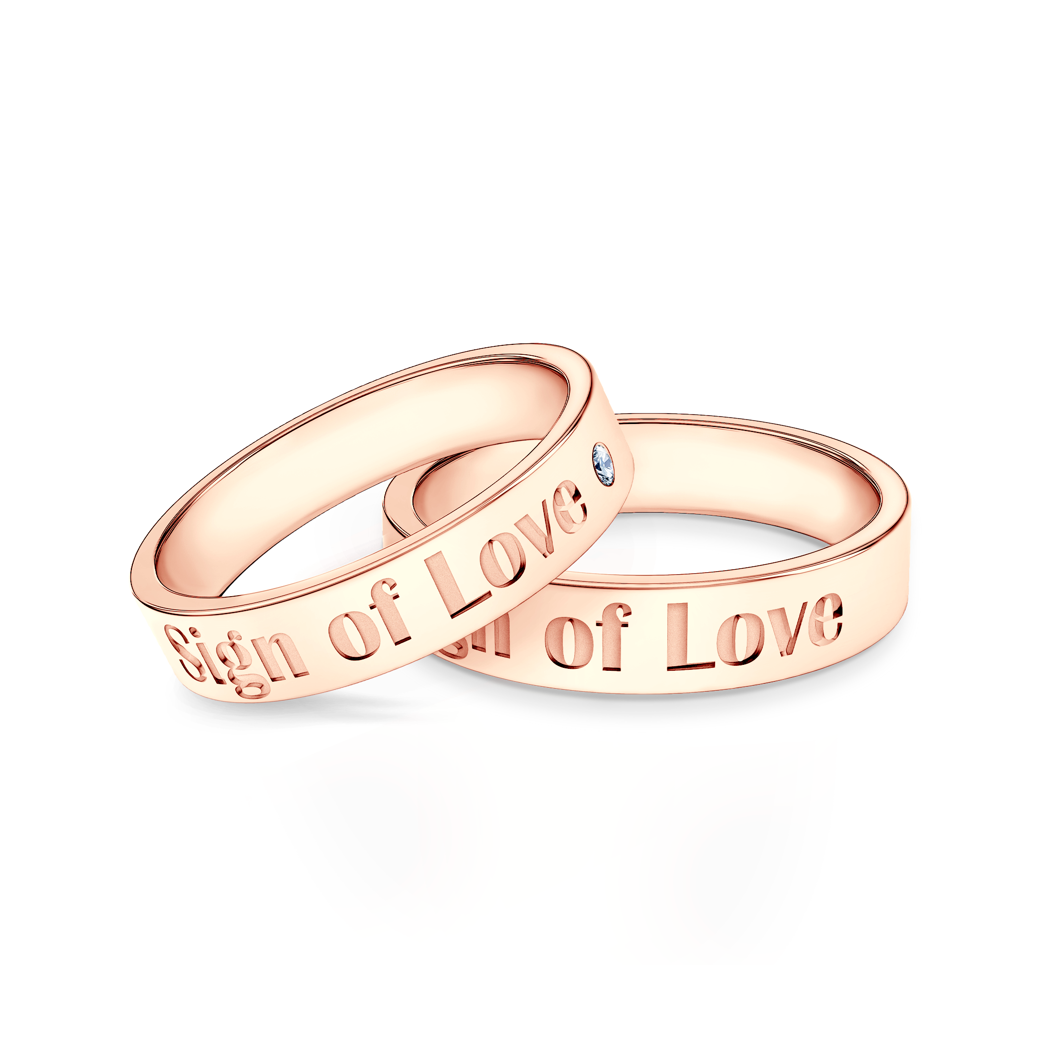 Obrączki partnerskie Sign of Love® wykonane z różowego złota (próba 585) o szerokości 4mm, polerowane, diament 0,01ct SI2/H, obrączki te posiadają grawer Sign of Love® - na życzenie klienta grawerujemy dowolną sentencję.