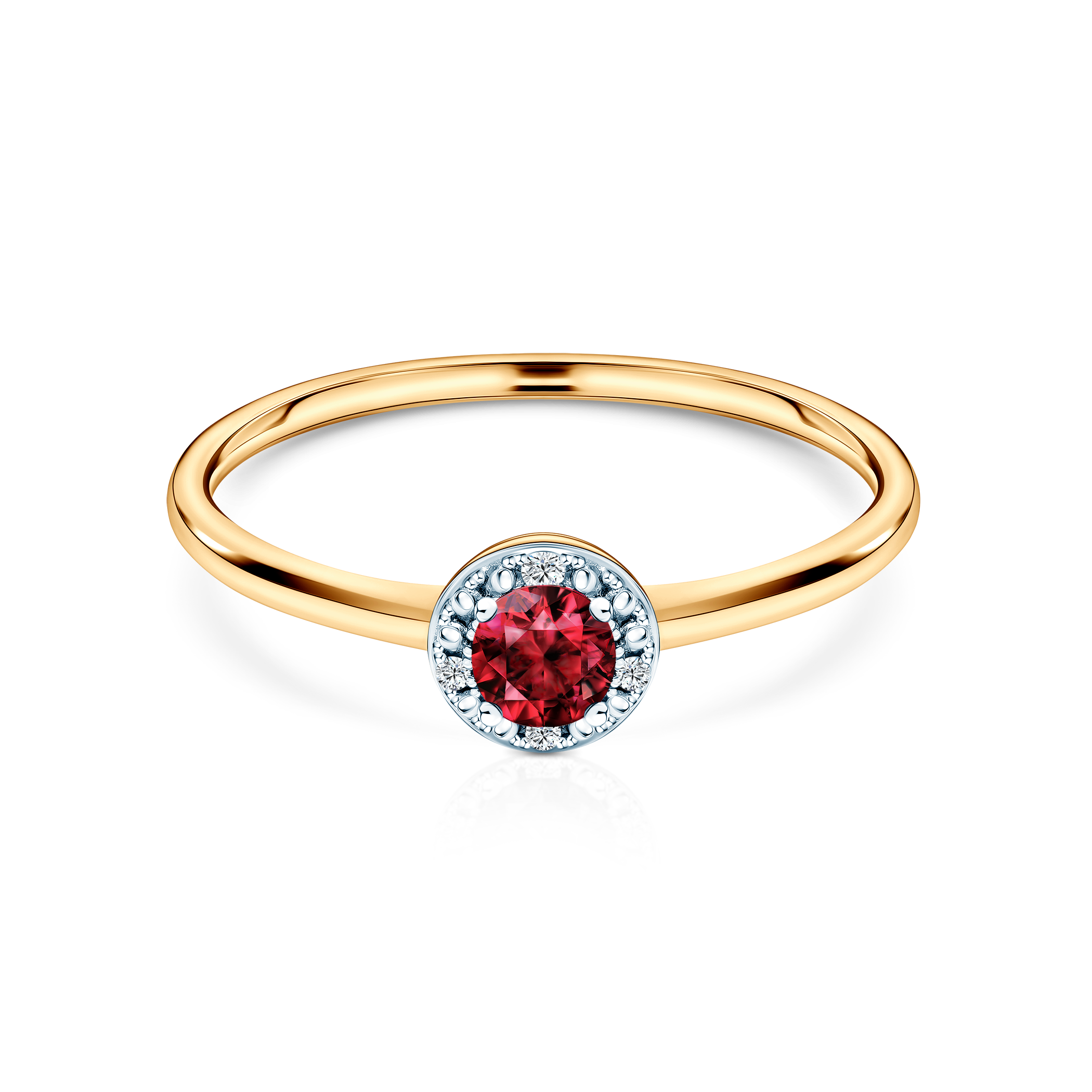 Pierścionek zaręczynowy z centralnym rubinem oraz diamentami o czystości i barwie SI2/H. Wykonany z 14-karatowego złota (próba 585).