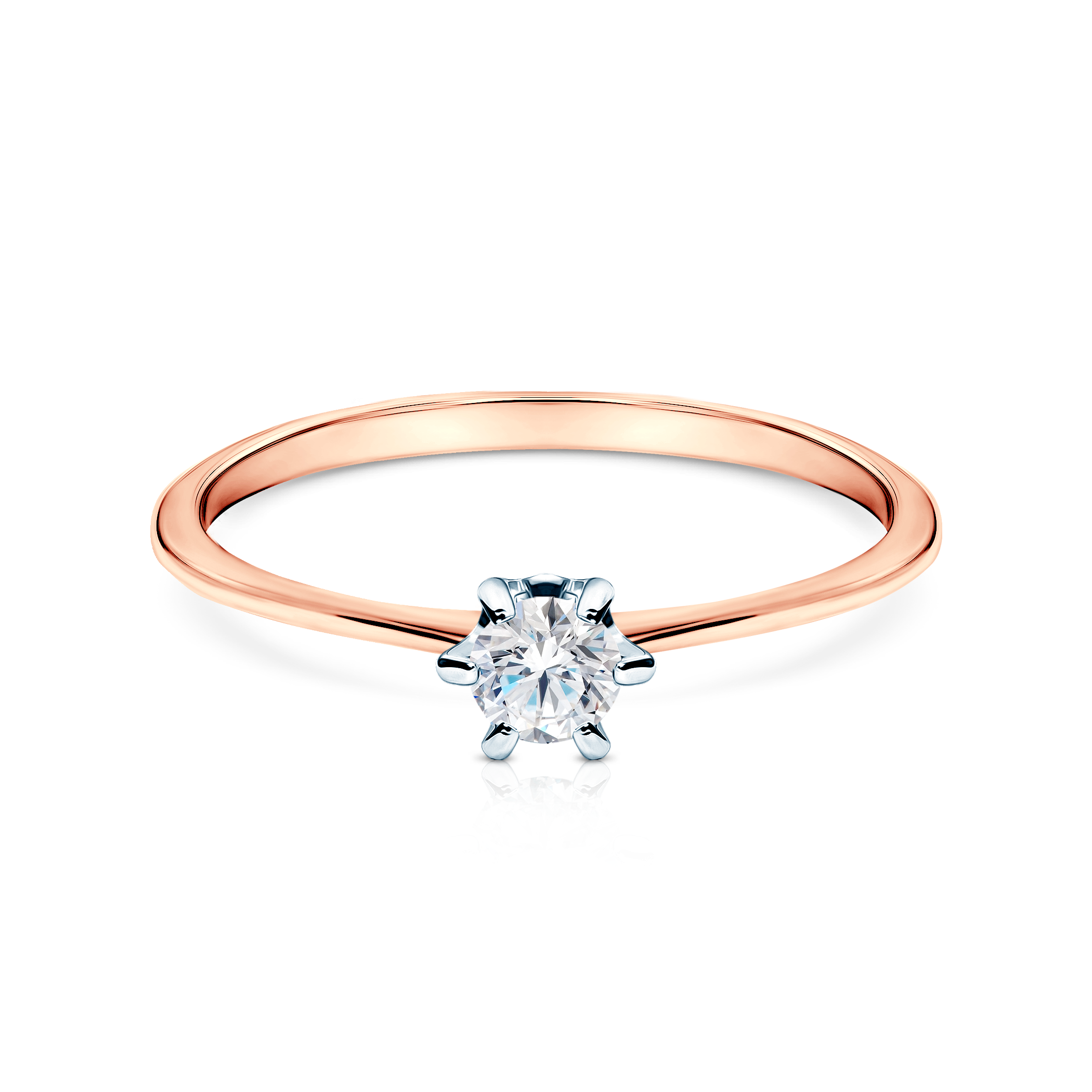 Pierścionek zaręczynowy z diamentem 0,17 ct o szlifie brylantowym wysokiej czystości SI2/H, wykonany z 14-karatowego różowego złota (próba 0,585).