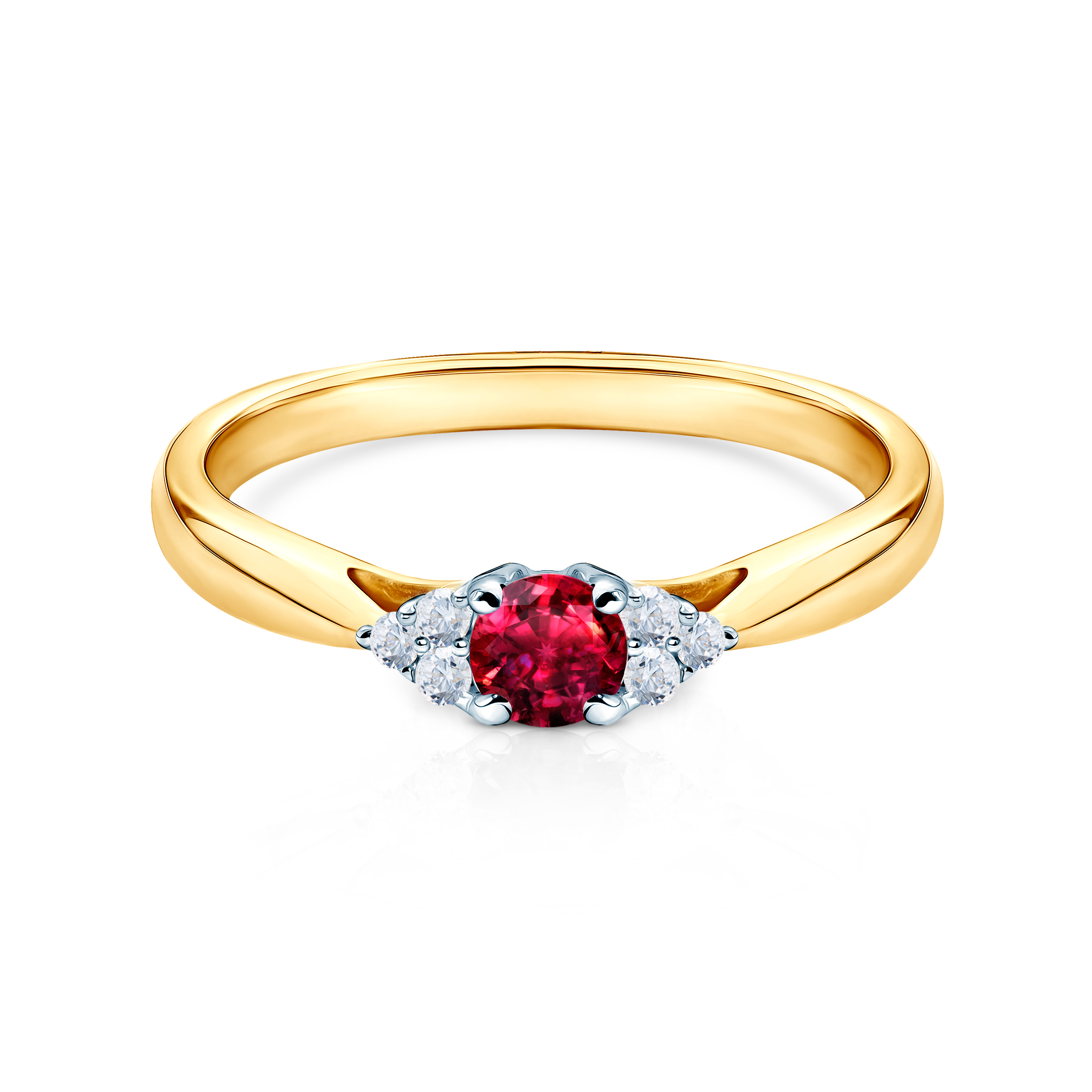 Pierścionek z rubinem o masie 0,17 ct oraz 6 diamentami bocznymi w szlifie brylantowym i wysokiej czystości SI/H, o łącznej masie ok. 0,05 ct. Wykonany z 14-karatowego dwukolorowego złota (próba 0,585).