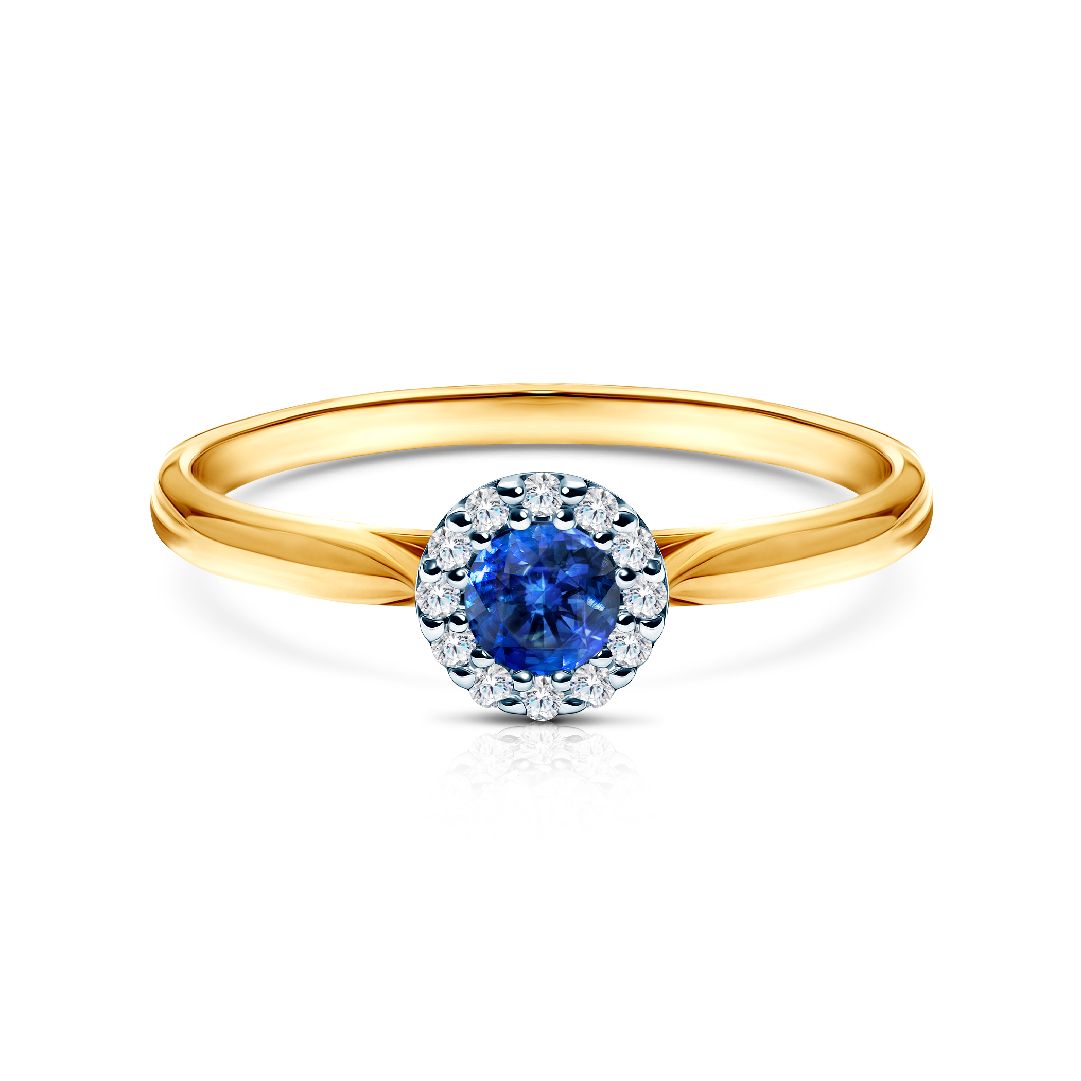 Pierścionek z niebieskim szafirem o masie 0,32 ct oraz 12 diamentami bocznymi w szlifie brylantowym i wysokiej czystości SI/H, o łącznej masie 0,07 ct. Wykonany z 14-karatowego dwukolorowego złota (próba 0,585).