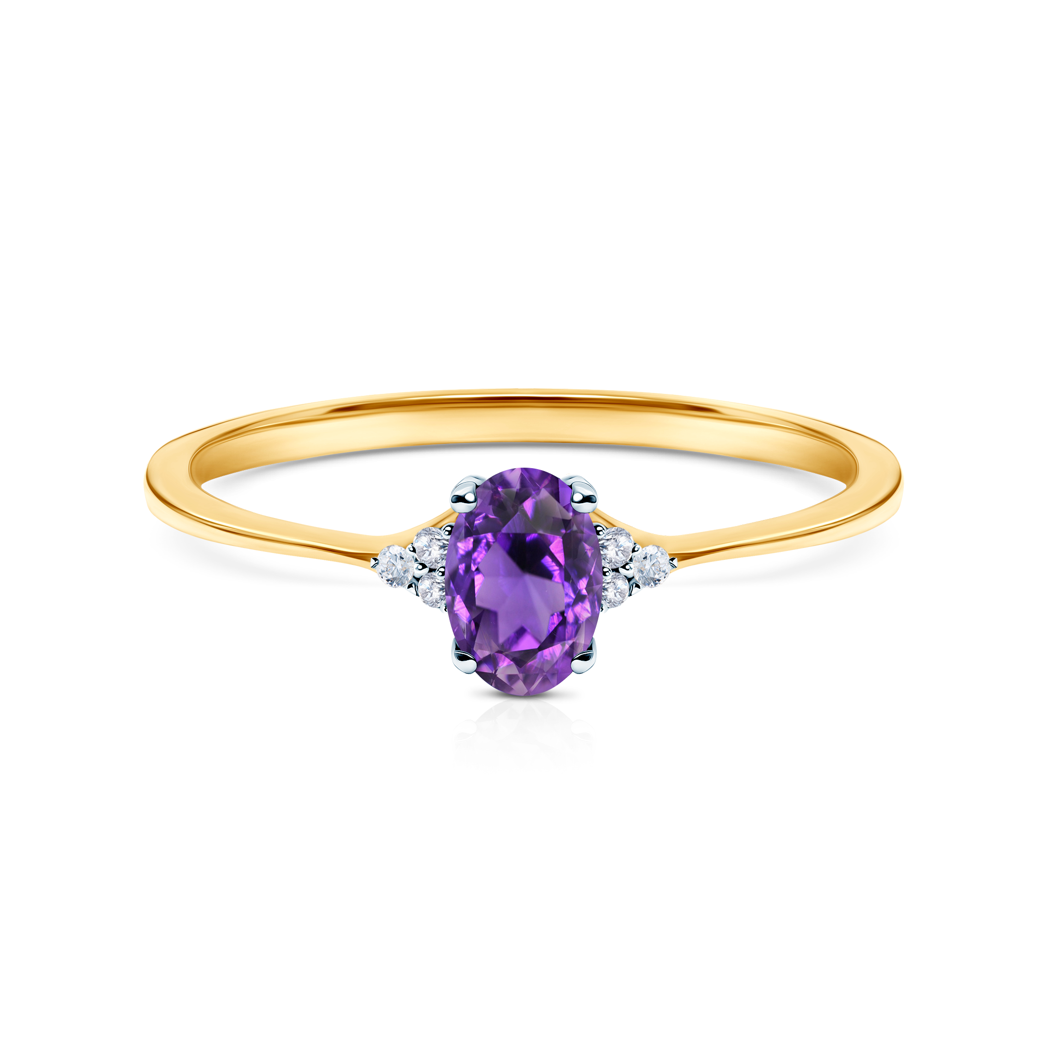 Pierścionek z ametystem o masie 0,36 ct oraz 6 diamentami bocznymi w szlifie brylantowym i wysokiej czystości SI/H, o łącznej masie 0,03 ct. Wykonany z 14-karatowego dwukolorowego złota (próba 0,585).