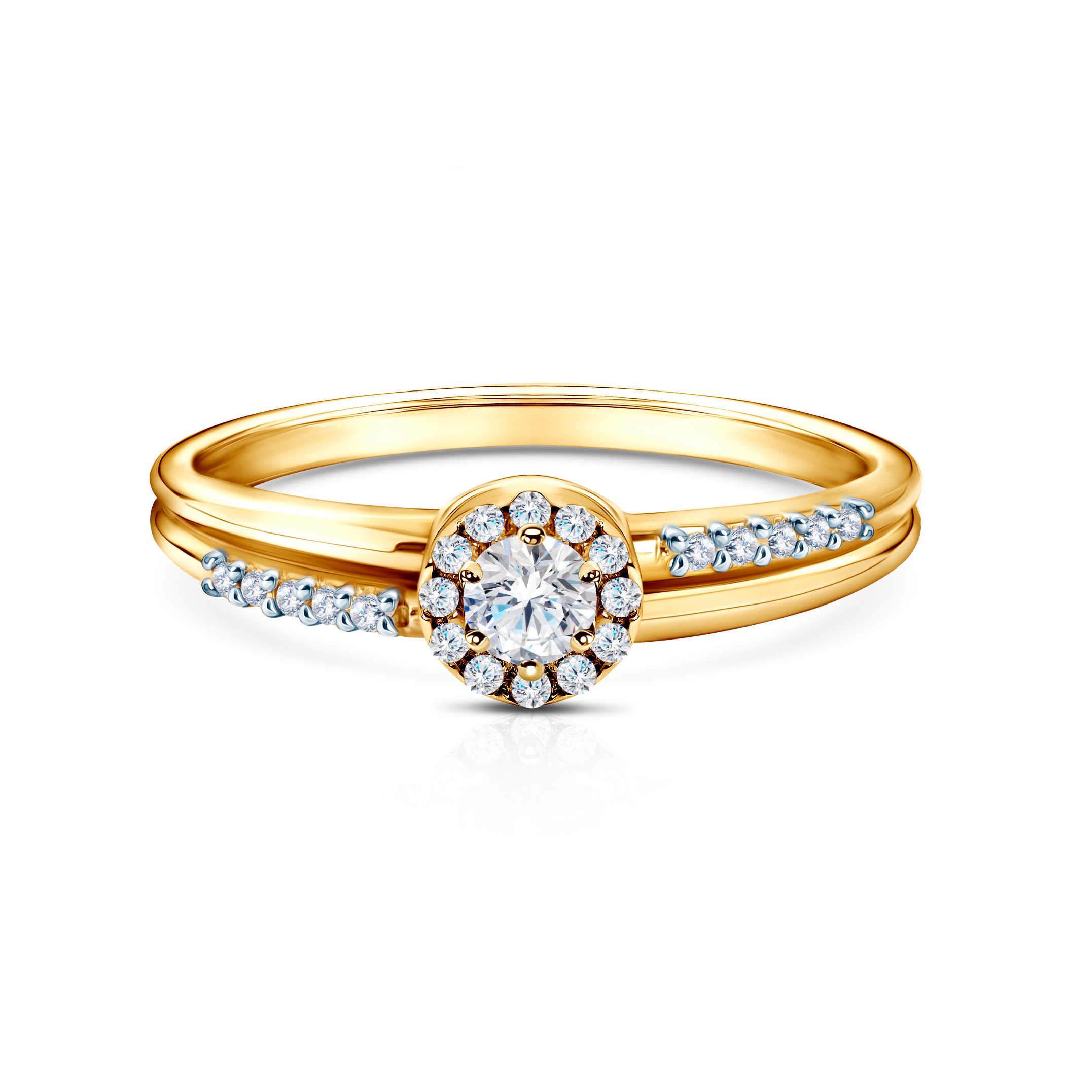 Pierścionek zaręczynowy z diamentem głównym 0,1ct i diamentami w szynie o łącznej masie ok. 0,11 w szlifie brylantowym wysokiej czystości SI2/H, wykonany z 14-karatowego żółtego złota (próba 0,585).