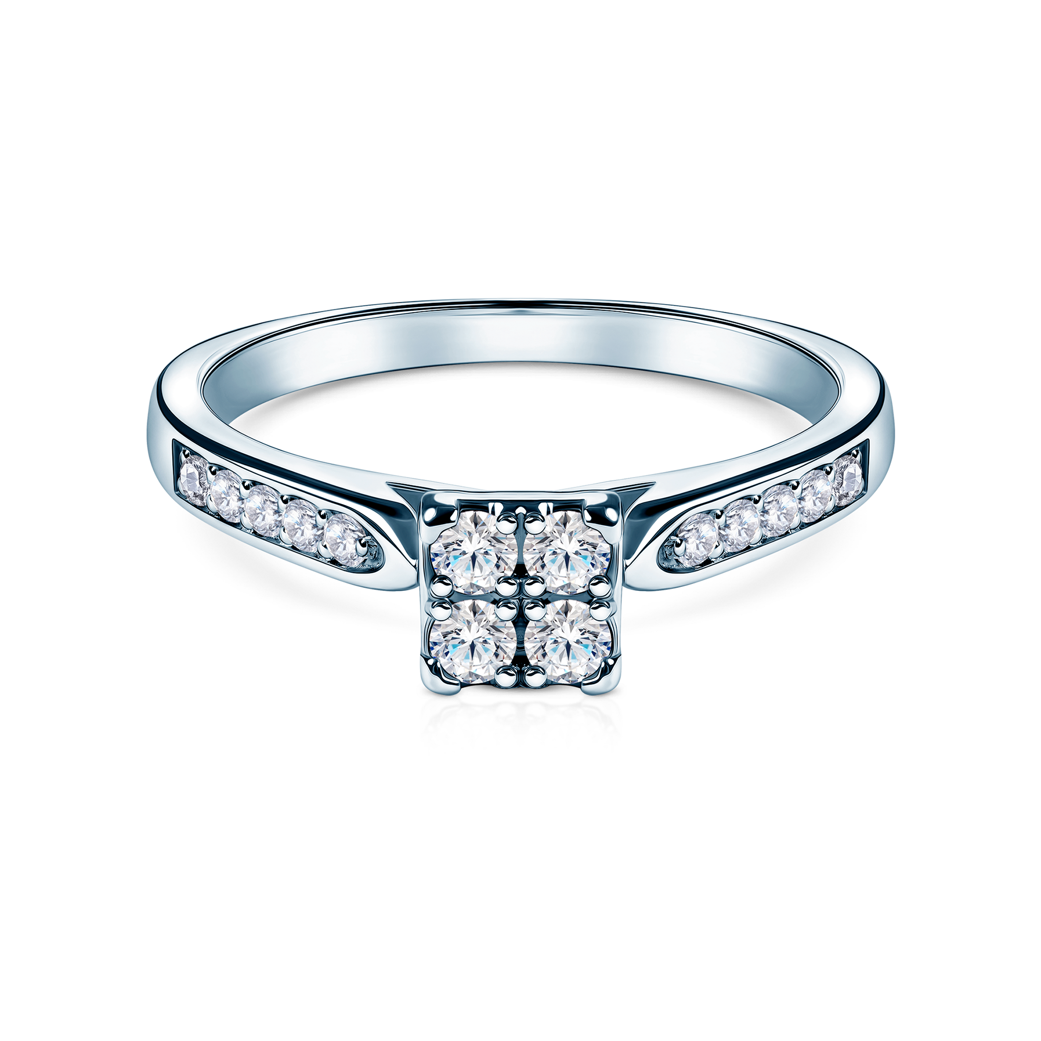 Pierścionek zaręczynowy z diamentem głównym o masie 0,11ct i diamentami dodatkowymi o łącznej masie ok. 0,05ct w szlifie brylantowym wysokiej czystości SI2/H, wykonany z 14-karatowego białego złota (próba 0,585).