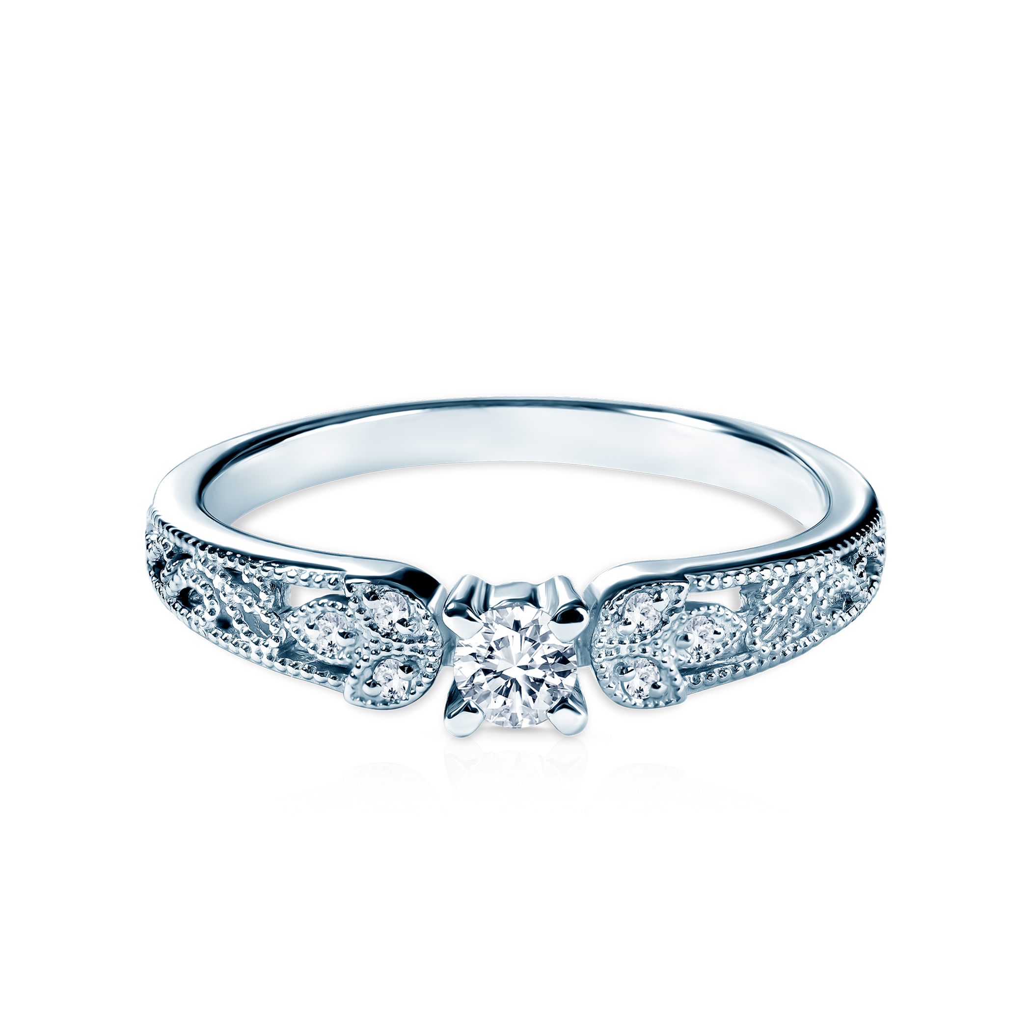 Pierścionek zaręczynowy z diamentem głównym o masie 0,1ct i diamentami dodatkowymi o łącznej masie 0,03ct w szlifie brylantowym wysokiej czystości SI2/H, wykonany z 14-karatowego białego złota (próba 0,585).