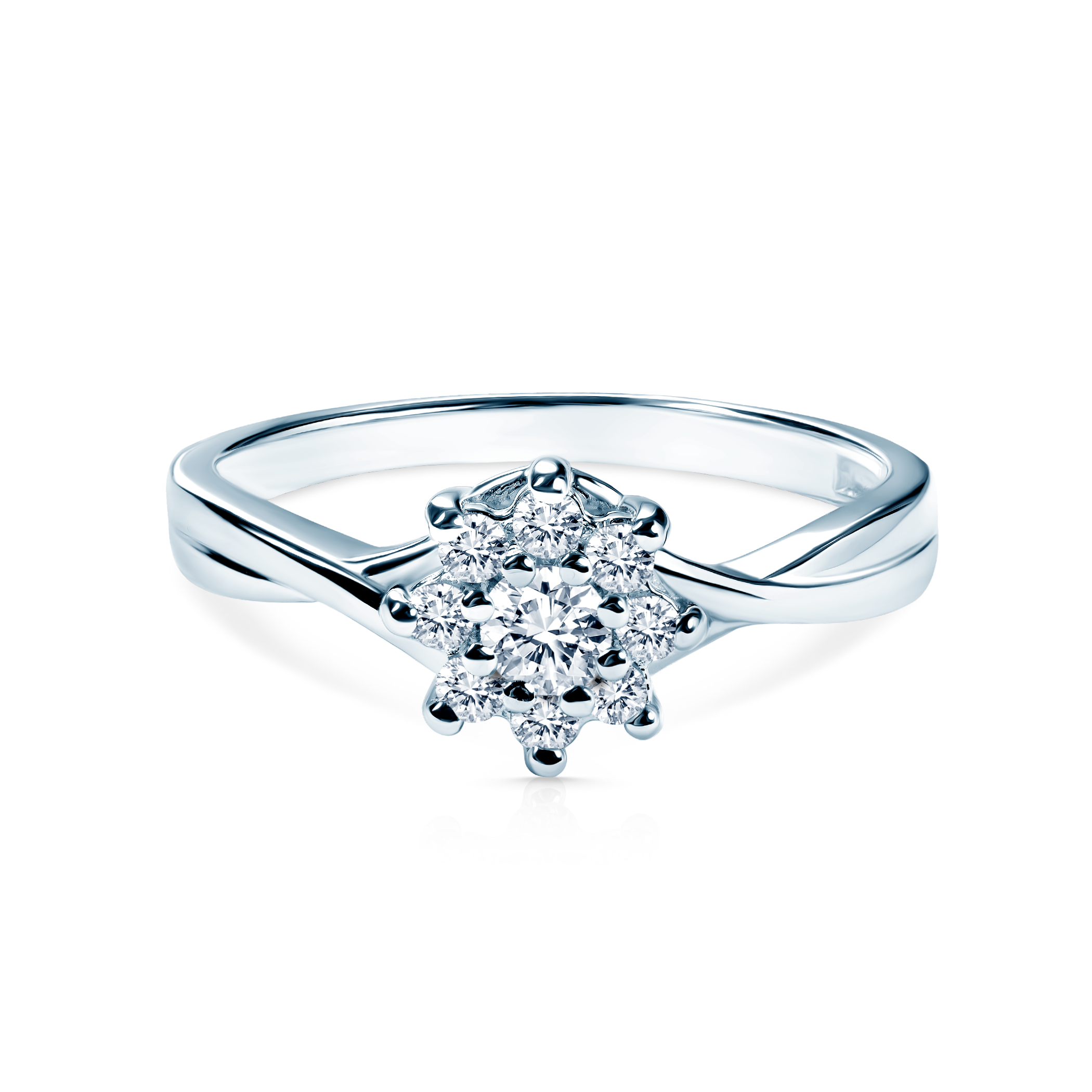 Pierścionek zaręczynowy z diamentem głównym i diamentami bocznymi o łącznej masie ok. 0,12ct w szlifie brylantowym wysokiej czystości SI2/H, wykonany z 14-karatowego białego złota (próba 0,585).