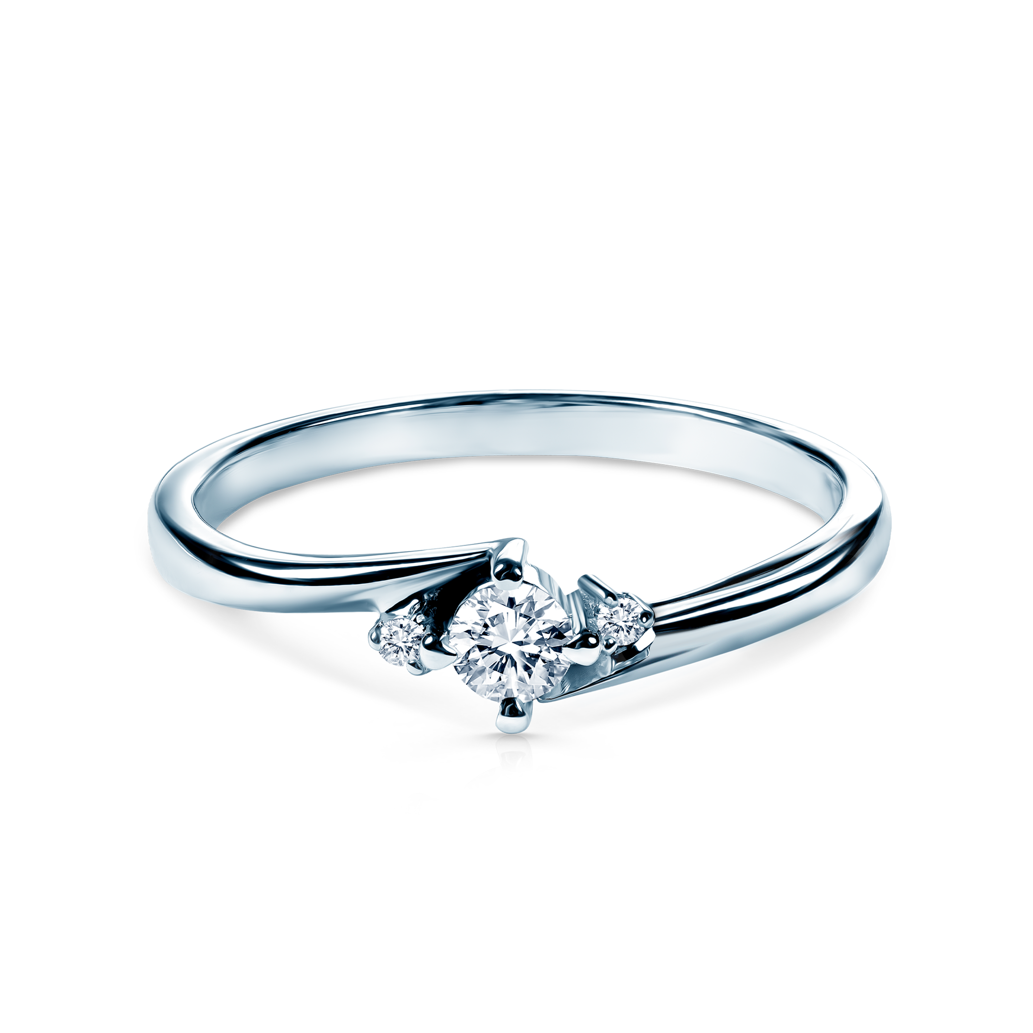 Pierścionek zaręczynowy z diamentem głównym o masie 0,1ct w szlifie brylantowym wysokiej czystości SI2/H, wykonany z 14-karatowego białego złota (próba 0,585).