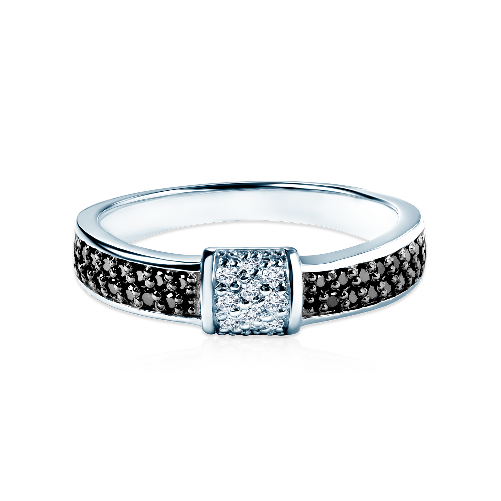 Pierścionek zaręczynowy z białymi brylantami o łącznej masie 0,05ct i czarnymi diamentami o łącznej masie 0,14ct w szlifie brylantowym wysokiej czystości SI2/H, wykonany z 14-karatowego białego złota (próba 0,585).