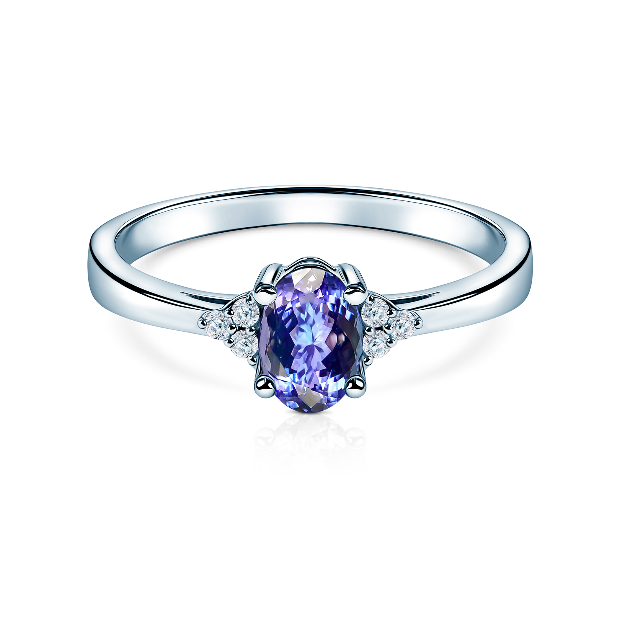Pierścionek zaręczynowy z tanzanitem o masie 0,40ct i diamentami dodatkowymi o łącznej masie 0,05ct w szlifie brylantowym, wykonany z 14-karatowego białego złota (próba 0,585).