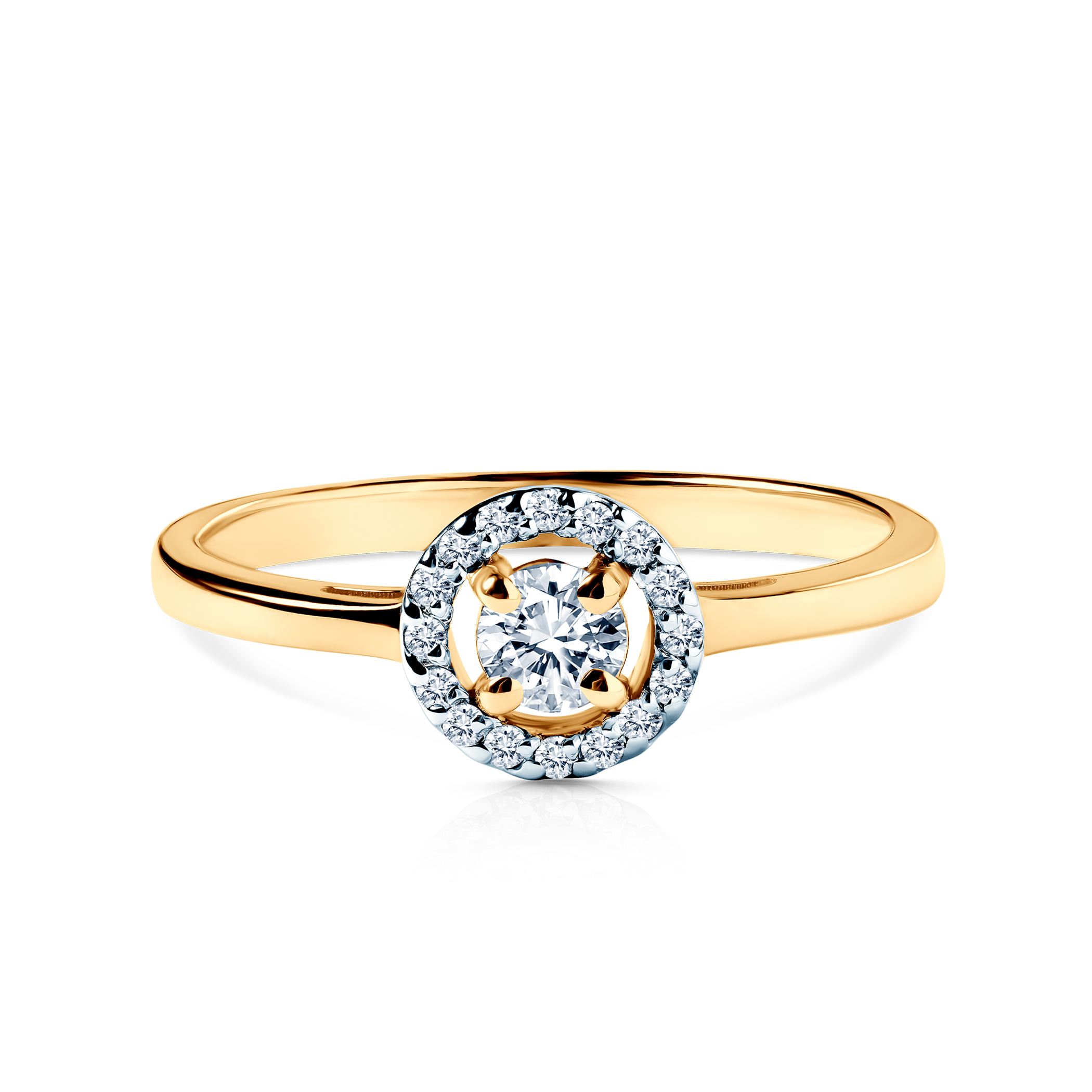Pierścionek zaręczynowy z diamentem głównym o masie 0,12ct i diamentami dodatkowymi o łącznej masie 0,08ct w szlifie brylantowym wysokiej czystości SI2/H, wykonany z 14-karatowego żółtego złota (próba 0,585).