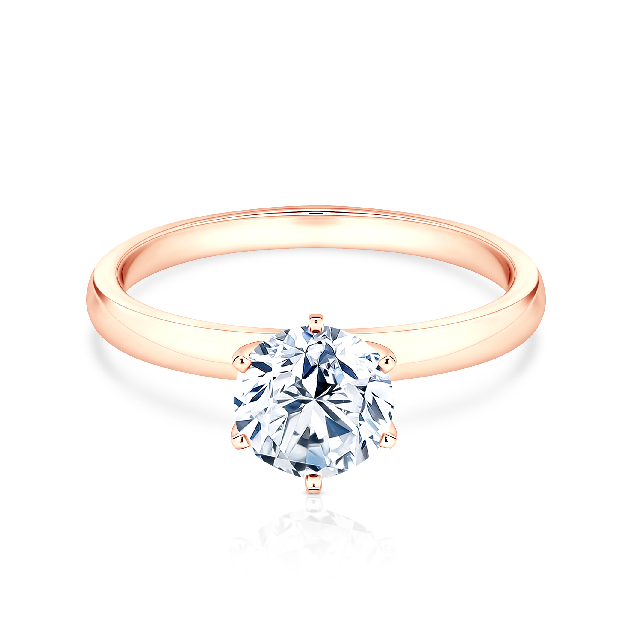 Pierścionek zaręczynowy z centralnie umieszczonym diamentem laboratoryjnym o masie 1 ct, o szlifie brylantowym. Wykonany z 14-karatowego różowego złota (próba 0,585).