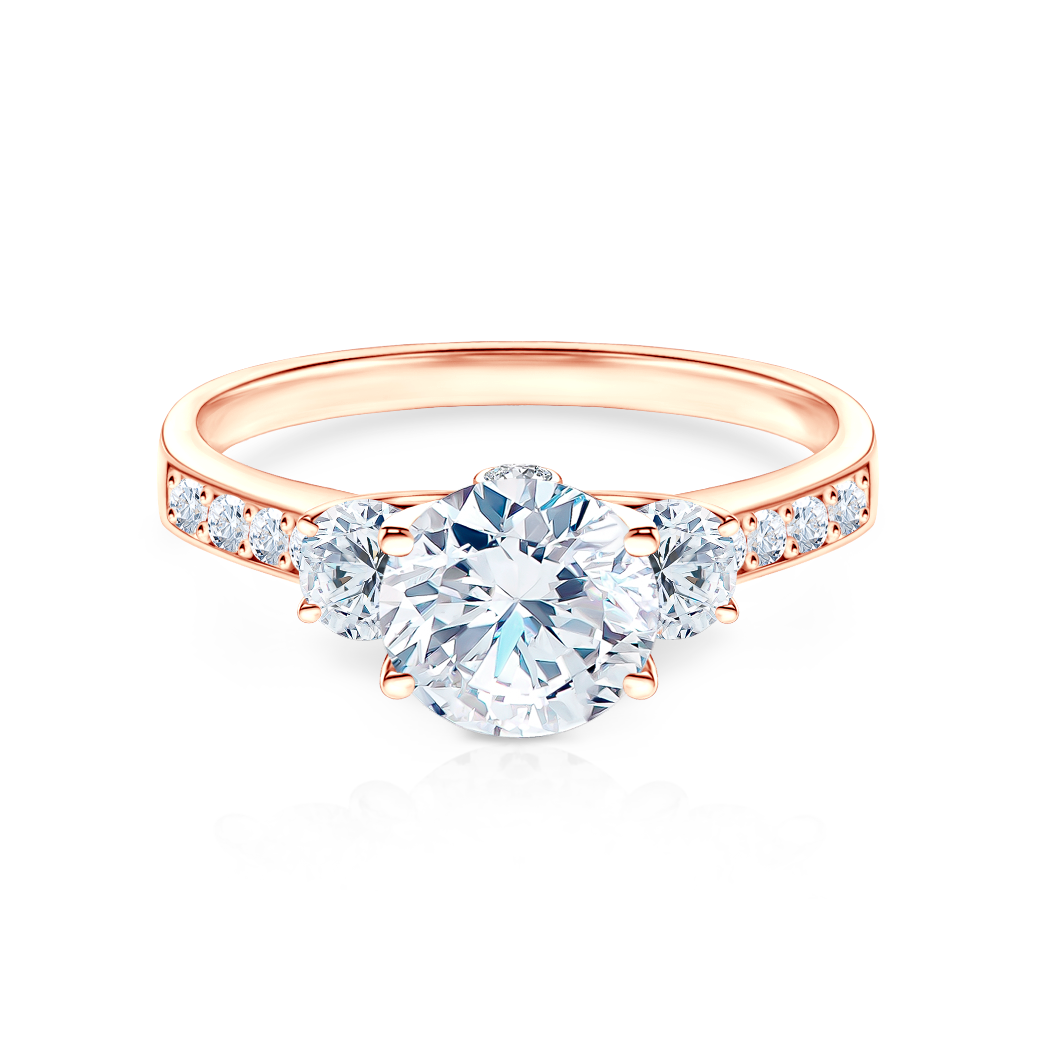 Pierścionek zaręczynowy z centralnie umieszczonym diamentem laboratoryjnym o masie 1 ct oraz 12 bocznymi diamentami laboratoryjnymi o łącznej masie 0,55 ct i szlifie brylantowym. Wykonany z 14-karatowego różowego złota (próba 585).