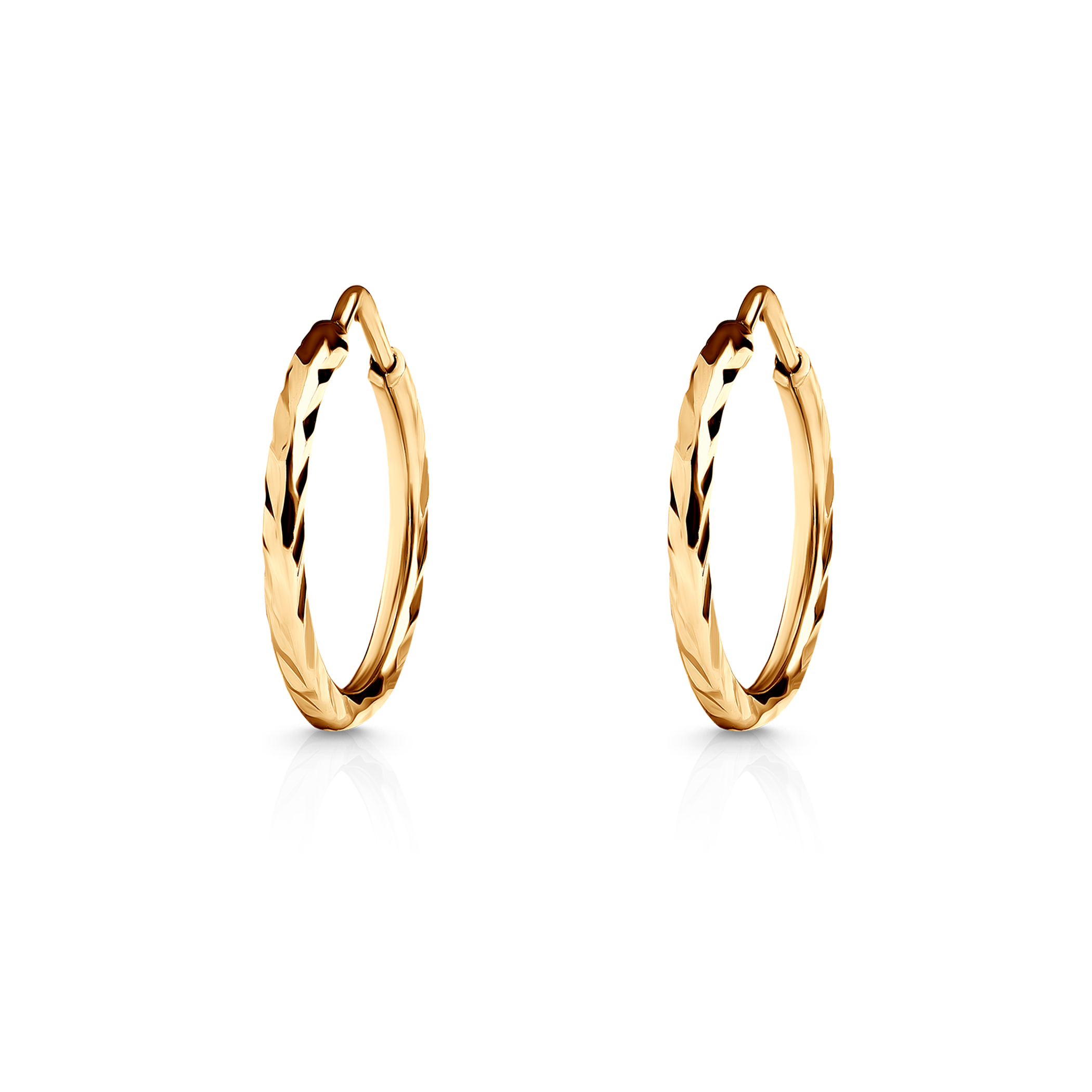 Okrągła, klasyczna forma o średnicy 12 mm zdobiona jest delikatnym, fasetowanym wzorem, który pięknie odbija światło, dodając biżuterii wyrazistości.