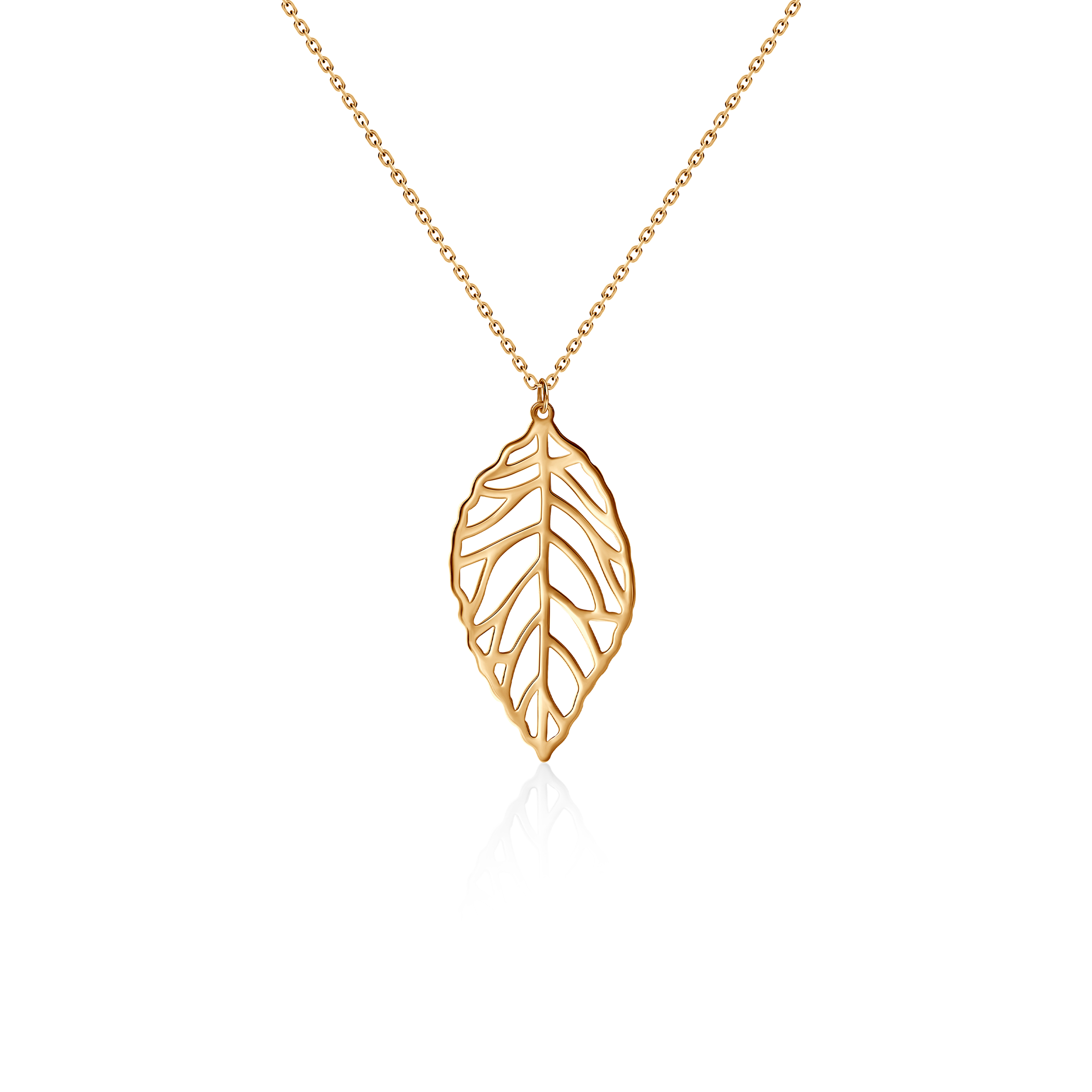 Ozdobny element o wymiarach 23x12 mm symbolizuje naturę i subtelną elegancję, doskonale harmonizując z minimalistycznym łańcuszkiem o długości 42 cm (+3 cm regulacji).