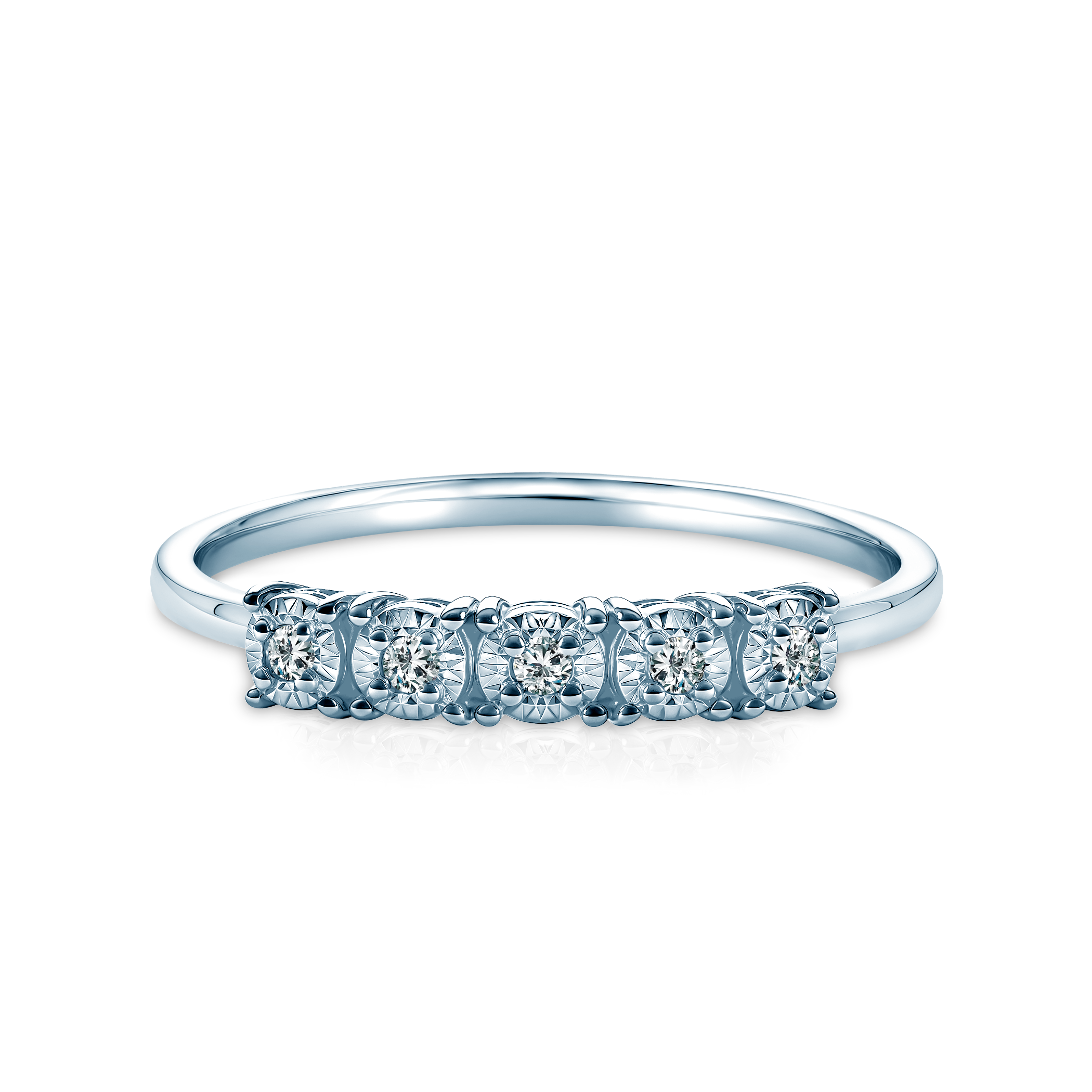 Na jego smukłej szynie osadzono pięć naturalnych diamentów o łącznej masie 0,01 ct, każdy starannie oprawiony w szlifie brylantowym.