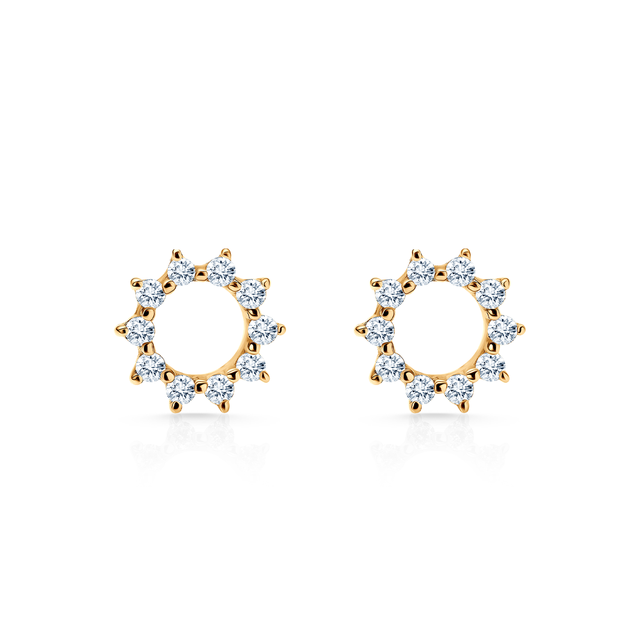 Złote kolczyki w formie otwartego okręgu to nowoczesna interpretacja klasyki. Wykonane z żółtego złota próby 585 i ozdobione 20 cyrkoniami o średnicy 1,3 mm, tworzą świetlisty motyw o średnicy 6,7 mm. Subtelne, a zarazem wyraziste – doskonałe na co dzień i na wyjątkowe chwile.