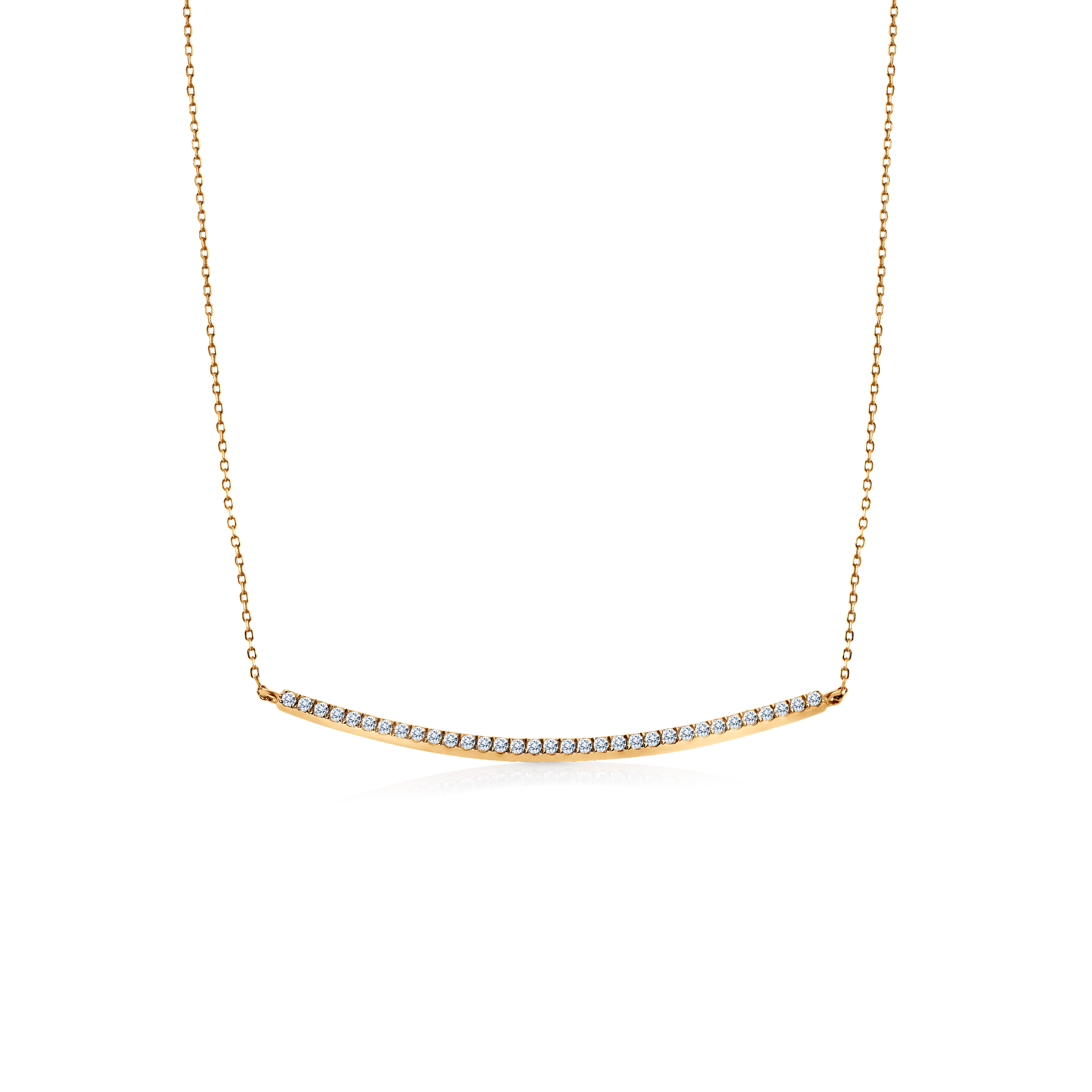 Delikatny naszyjnik SAVICKI z żółtego złota próby 585 ozdobiony 33 błyszczącymi cyrkoniami o brylantowym szlifie. Subtelny, wygięty element dekoracyjny nadaje całości elegancji i nowoczesnego charakteru. Idealny jako stylowy dodatek na co dzień i na wyjątkowe okazje.