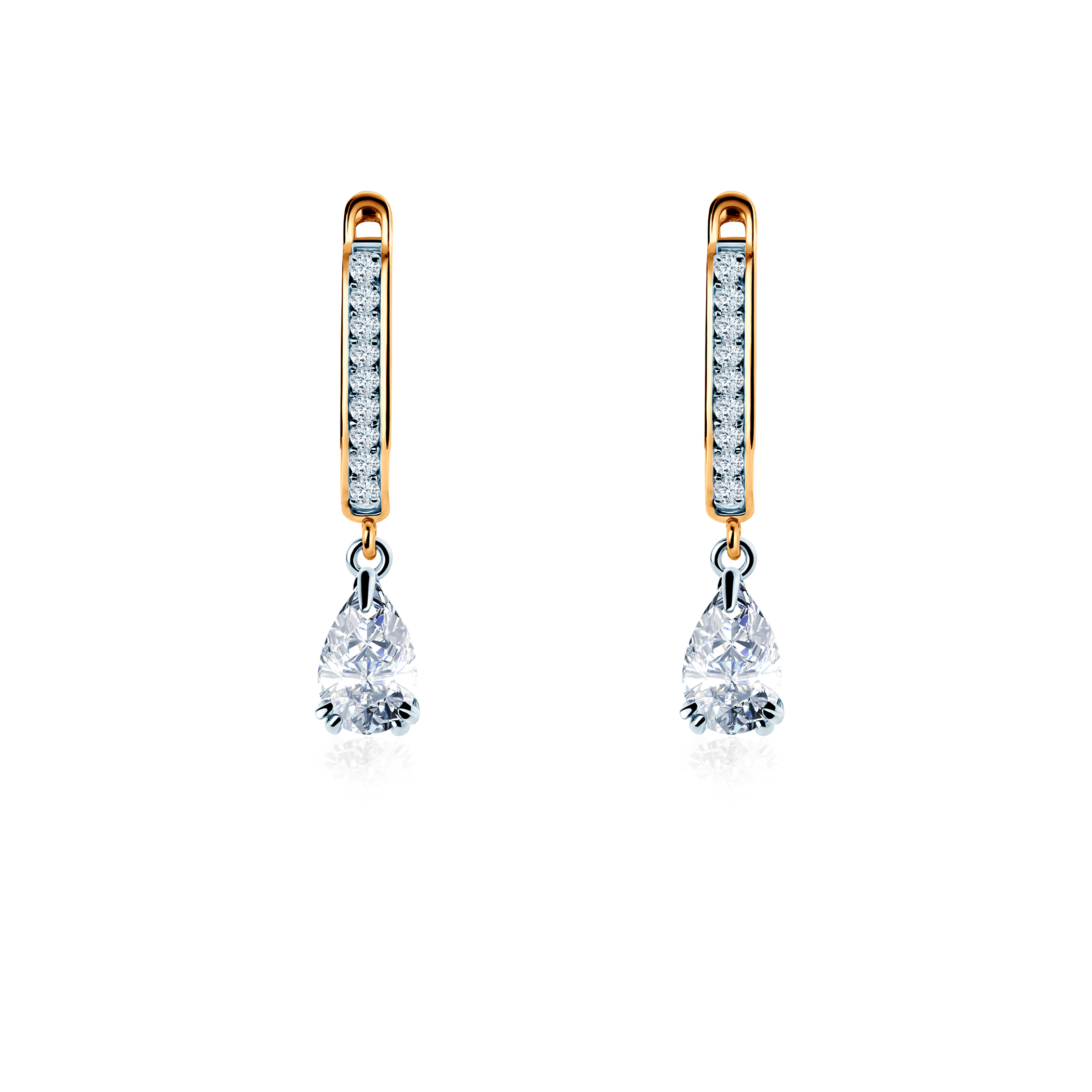 Kolczyki z 2 diamentami laboratoryjnymi o szlifie łezki, o łącznej masie 1ct. Wykonane z połączenia 14-karatowego żółtego i białego złota (próba 585).