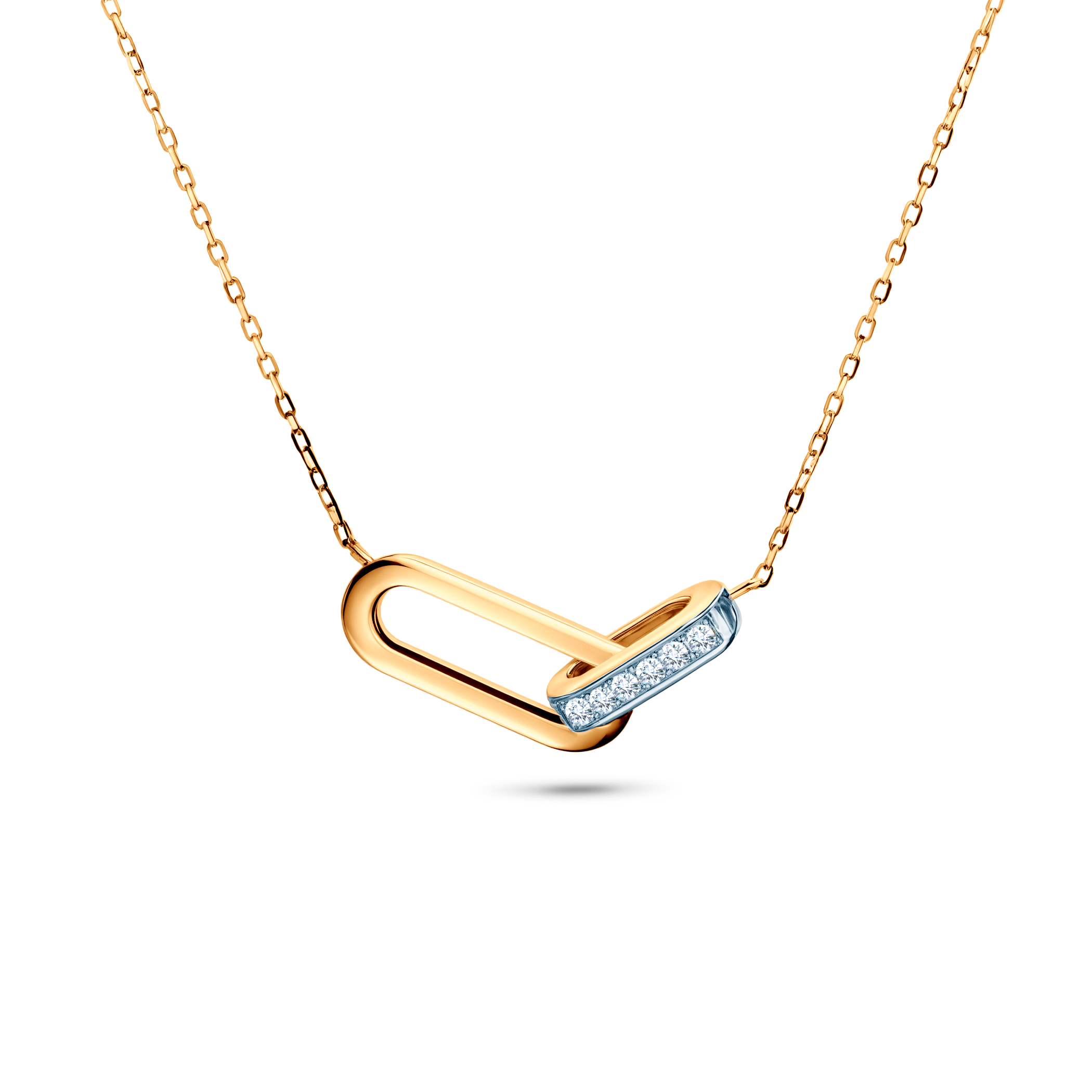 W naszyjniku zostało osadzonych 9 diamentów o szlifie brylantowym i łącznej masie 0,04 ct. Naszyjnik wykonany z połączenia białego i żółtego złota (próba 585).
