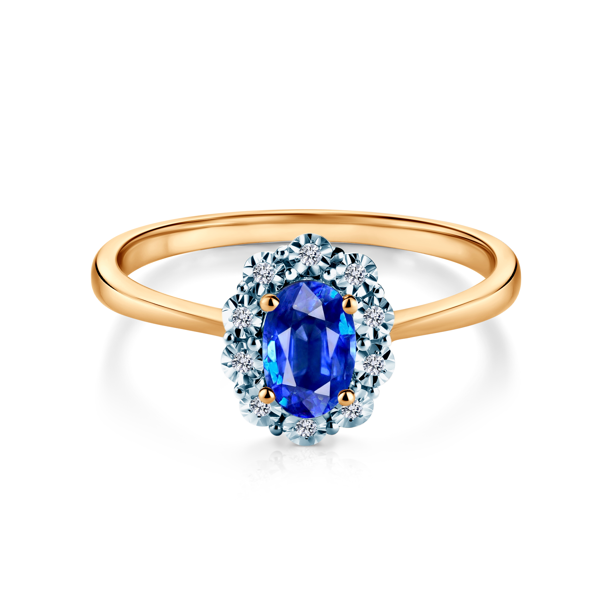 Pierścionek zaręczynowy z centralnym niebieskim szafirem o masie 0,57ct w szlifie owalnym oraz 10 diamentami o łącznej masie 0,04ct i czystości SI/H. Wykonany z połączenia 14-karatowego żółtego i białęgo złota (próba 585).