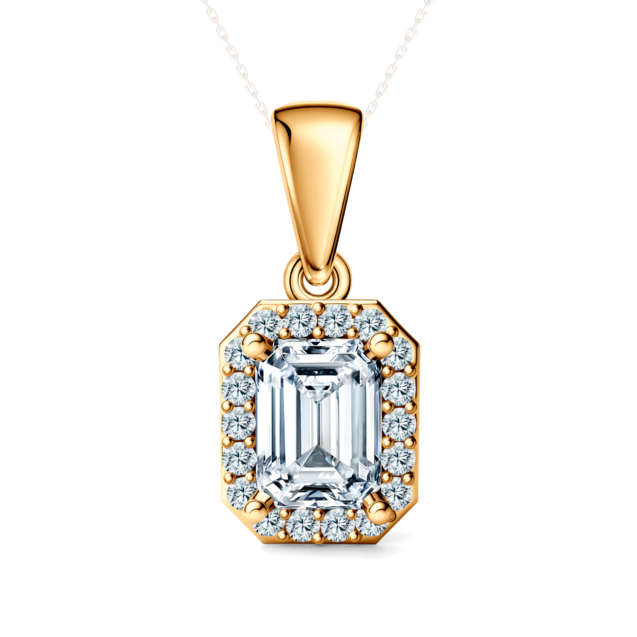 Zawieszka wykonana z 14-karatowego żółtego złota (próba 585). W zawieszce osadzony został diament laboratoryjny o masie 0,49 ct i szlifie szmaragdowym oraz 18 diamenty laboratoryjny o łącznej masie 0,09 ct.