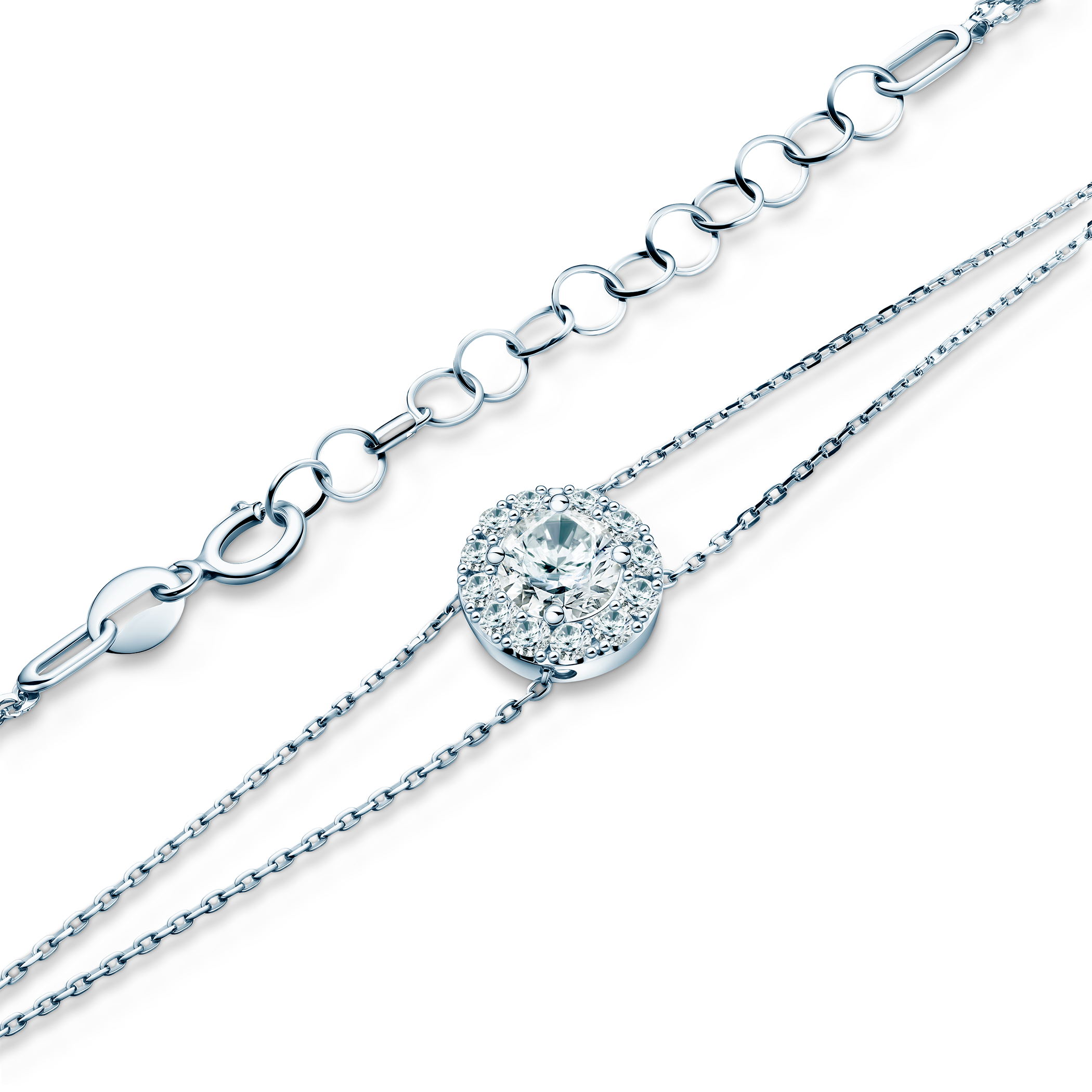 W bransoletce został osadzony diament o szlifie brylantowym i masie 0,14 ct oraz 12 diamentów o szlifie brylantowym i łącznej masie 0,06 ct. Bransoletka wykonana z białego złota (próba 585).