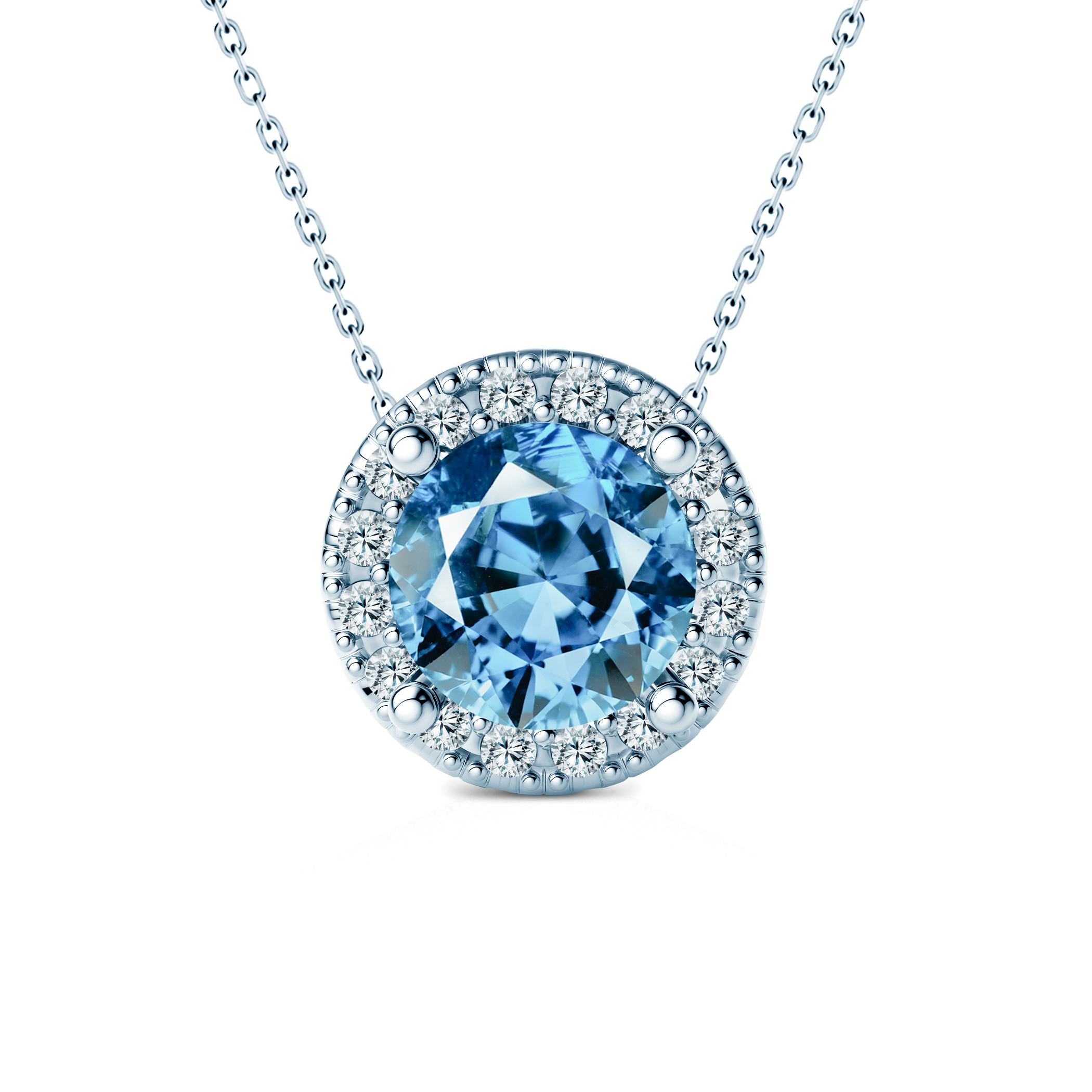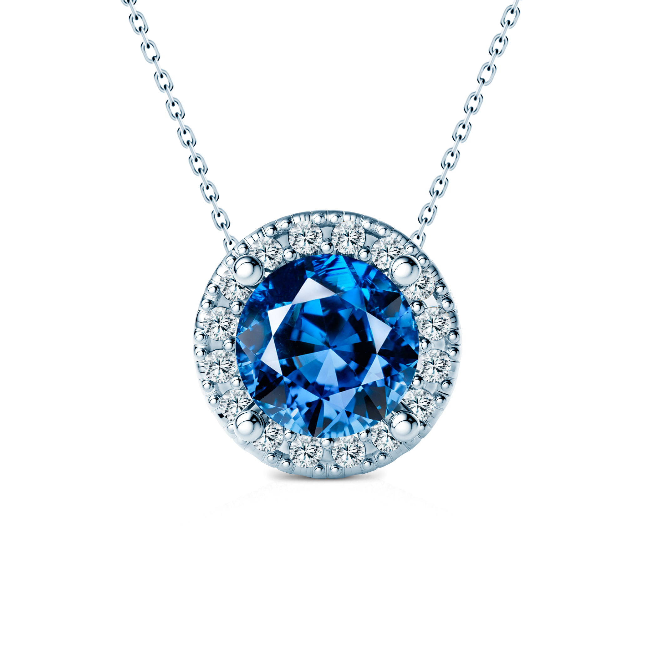 W naszyjniku został osadzony niebieski diament laboratoryjny o szlifie brylantowym i masie 0,50 ct oraz 16 diamentów laboratoryjnych o szlifie brylantowym i łącznej masie 0,08 ct. Naszyjnik wykonany z białego złota (próba 585).