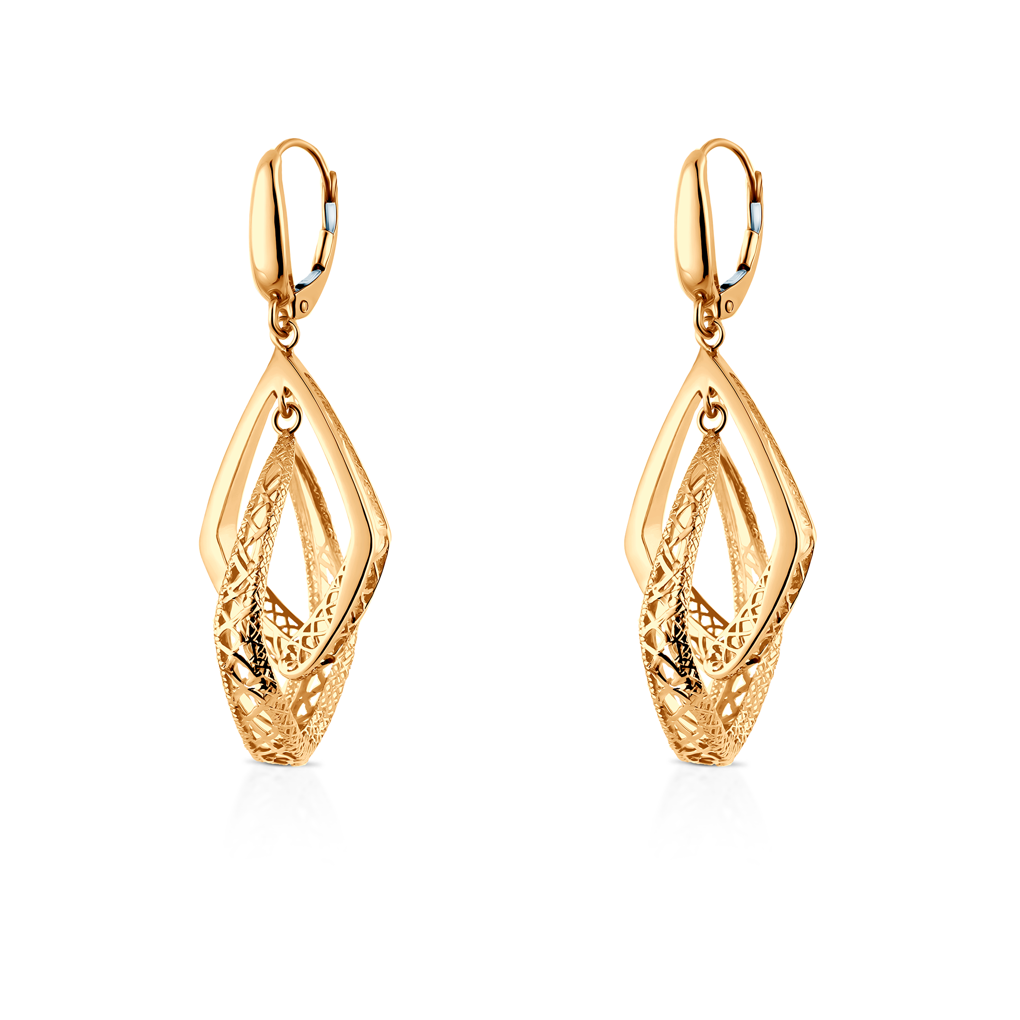 Szerokość górnego rombu [mm] ok. 13,80 Wysokość górnego rombu [mm] ok. 23,20 Szerokość dolnego rombu [mm] ok. 13,60 Wysokość dolnego rombu [mm] ok. 22,60 Długość kolczyka z zapięciem [mm] ok. 44,00