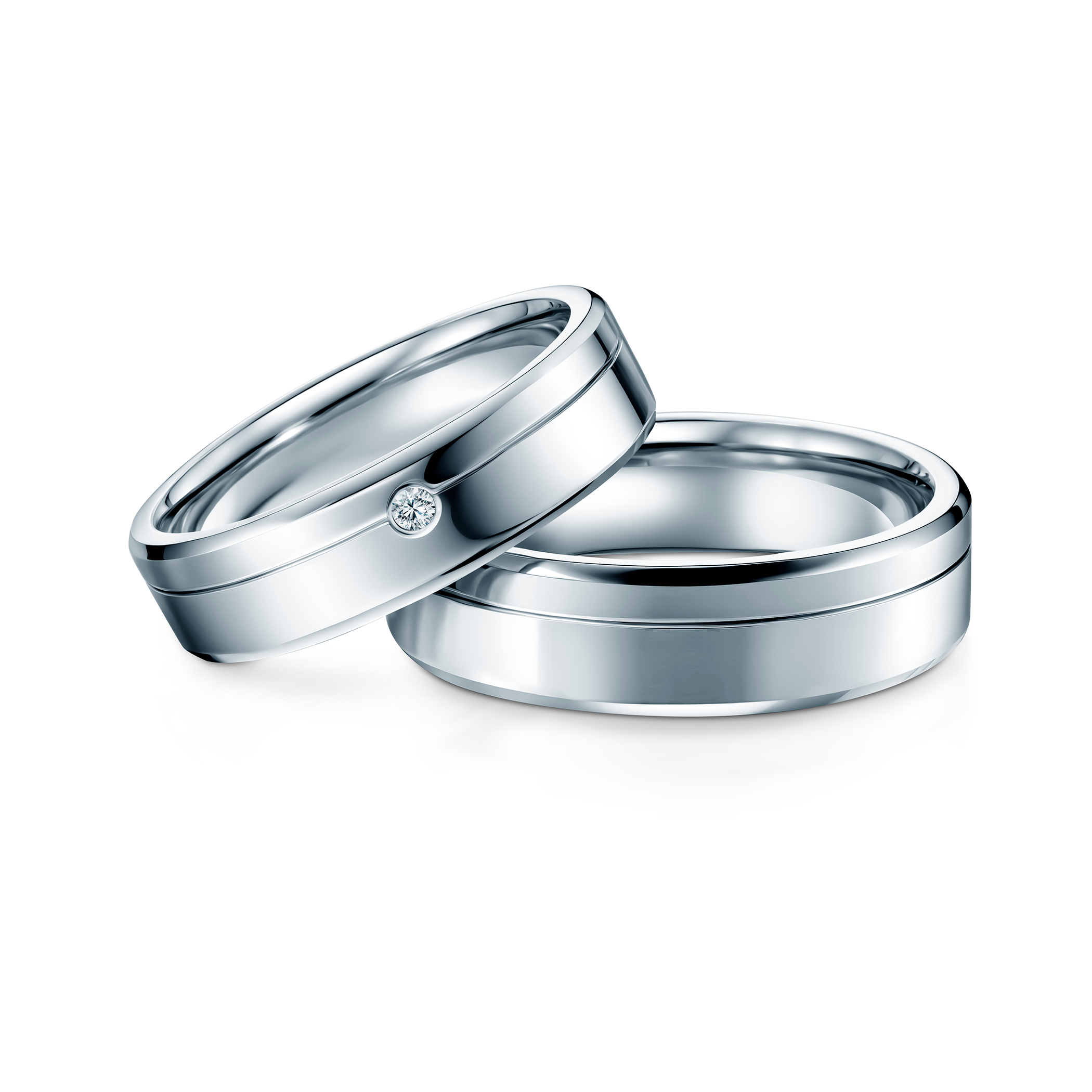 Obrączki ślubne fazowane wykonane z tytanu. Obrączka damska z cyrkonią, moissanitem lub diamentem.