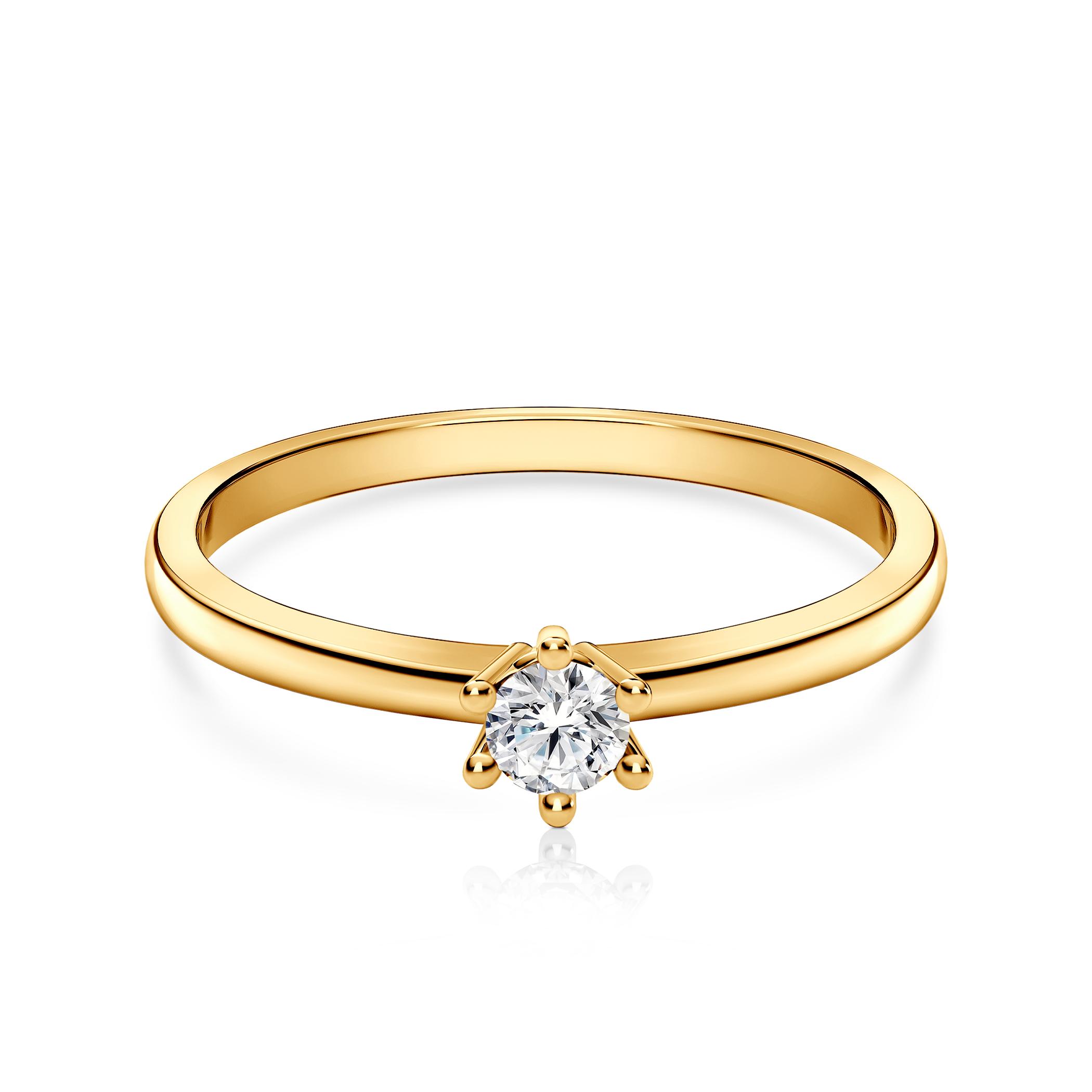 Pierścionek zaręczynowy z centralnie umieszczonym moissanitem 0,10 ct o wysokiej jakości i szlifie brylantowym. Pierścionek z moissanitem został wykonany z 14-karatowego żółtego złota (próba 585).