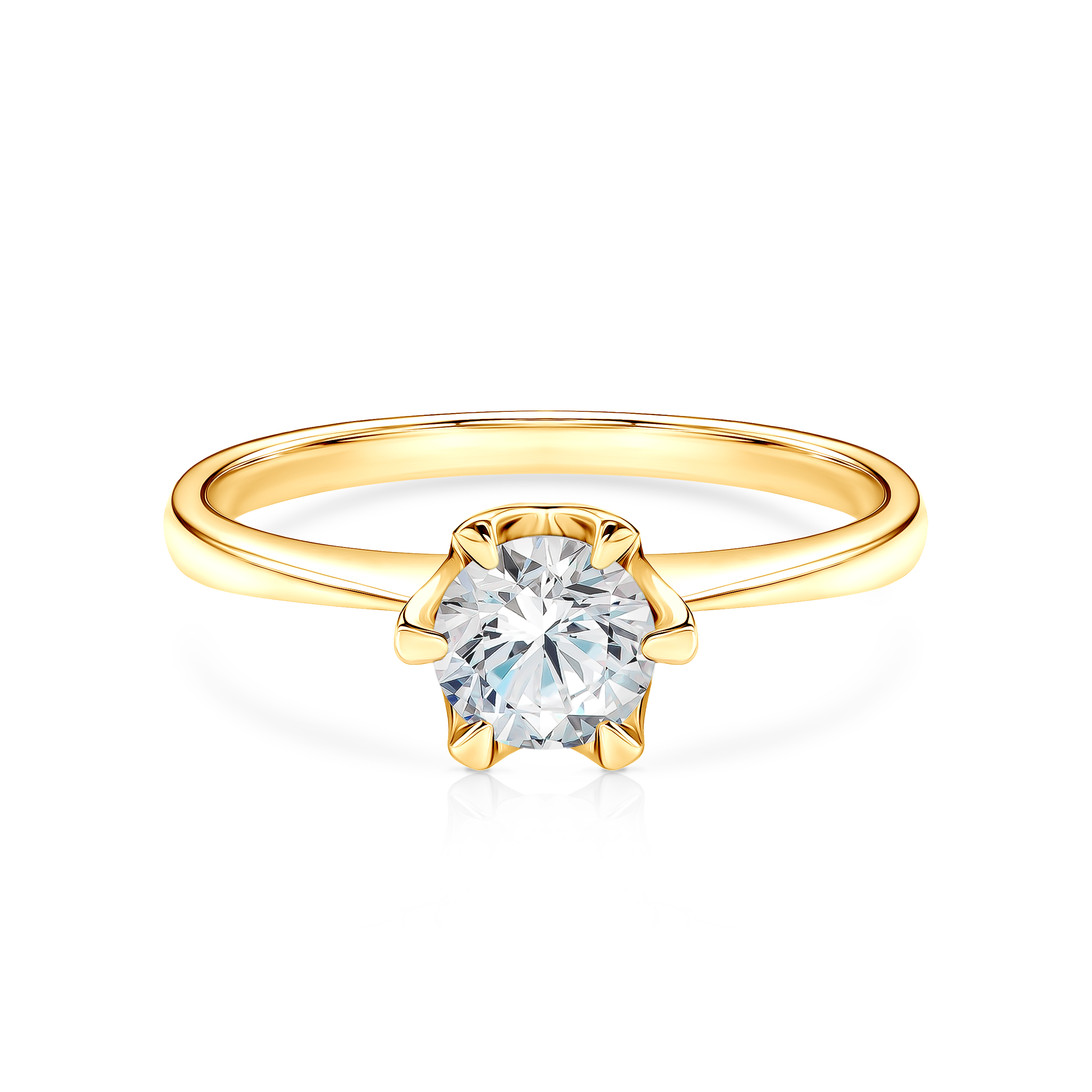Pierścionek zaręczynowy z centralnie umieszczonym moissanitem 0,5 ct o wysokiej jakości i szlifie brylantowym. Pierścionek z moissanitem został wykonany z 14-karatowego żółtego złota (próba 585).