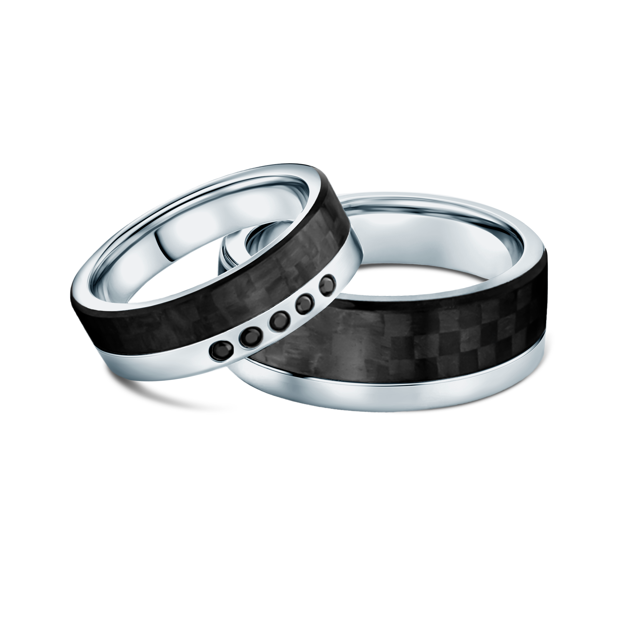 Obrączki ślubne płaskie wykonane z carbonu i tytanu. Obrączka damska z cyrkonią, moissanitem lub diamentem.
