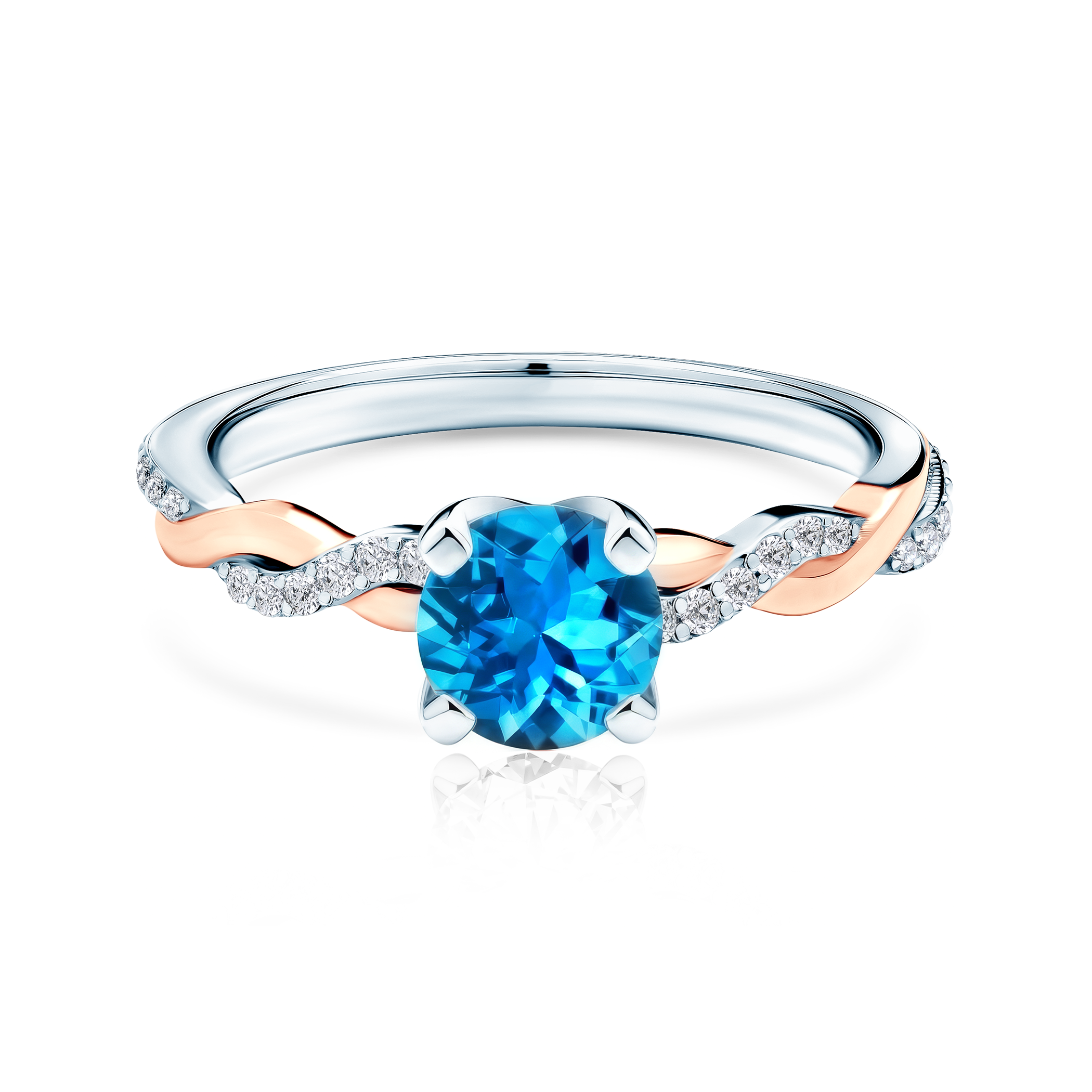 Pierścionek zaręczynowy z niebieskim topazem 0,5ct o szlifie brylantowym oraz kamieniami w szynie 28szt x 0.0035ct Si2/H, wykonany z połączenia białego i różowego złota (próba 0,585).