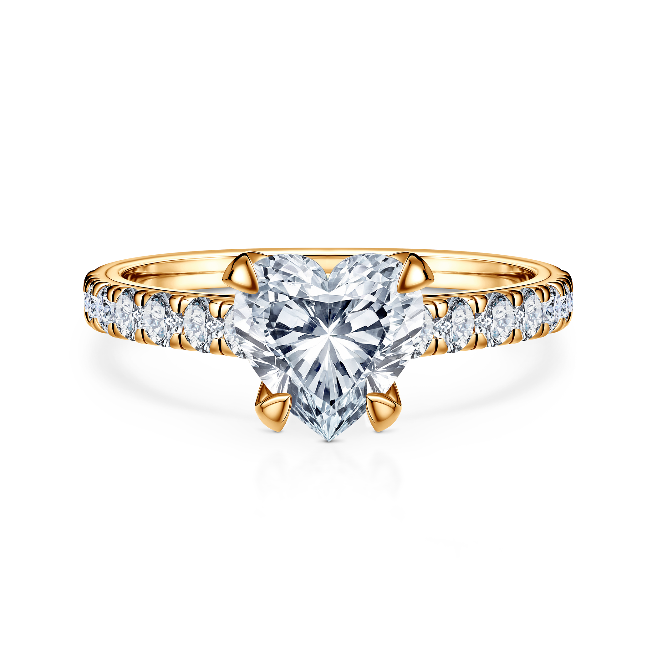 Pierścionek zaręczynowy z centralnie umieszczonym diamentem o masie 1 ct wysokiej czystości SI2/H, o szlifie serce. Wykonany z 14-karatowego żółtego złota (próba 0,585).