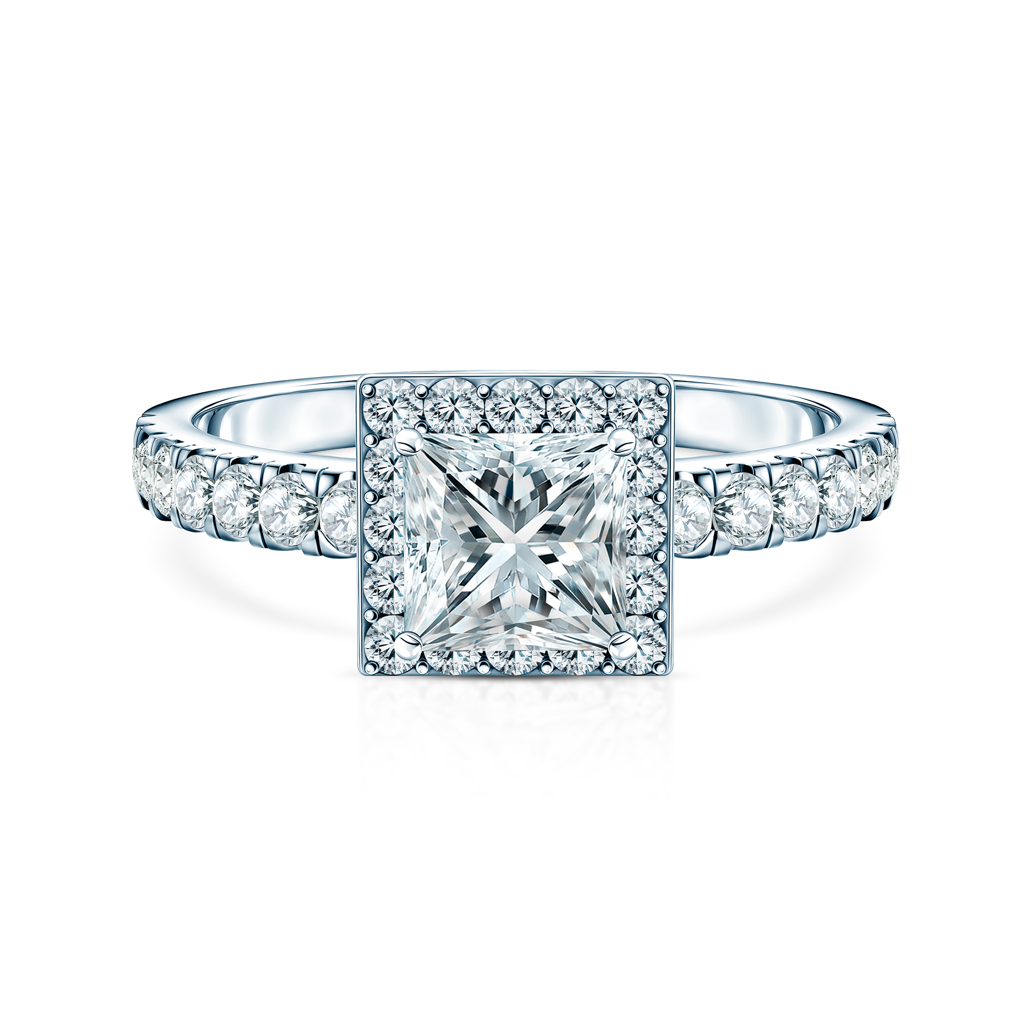 Pierścionek zaręczynowy z centralnie umieszczonym diamentem o masie 0,5 ct wysokiej czystości SI2/H, o szlifie princessa. Wykonany z 14-karatowego białego złota (próba 0,585).